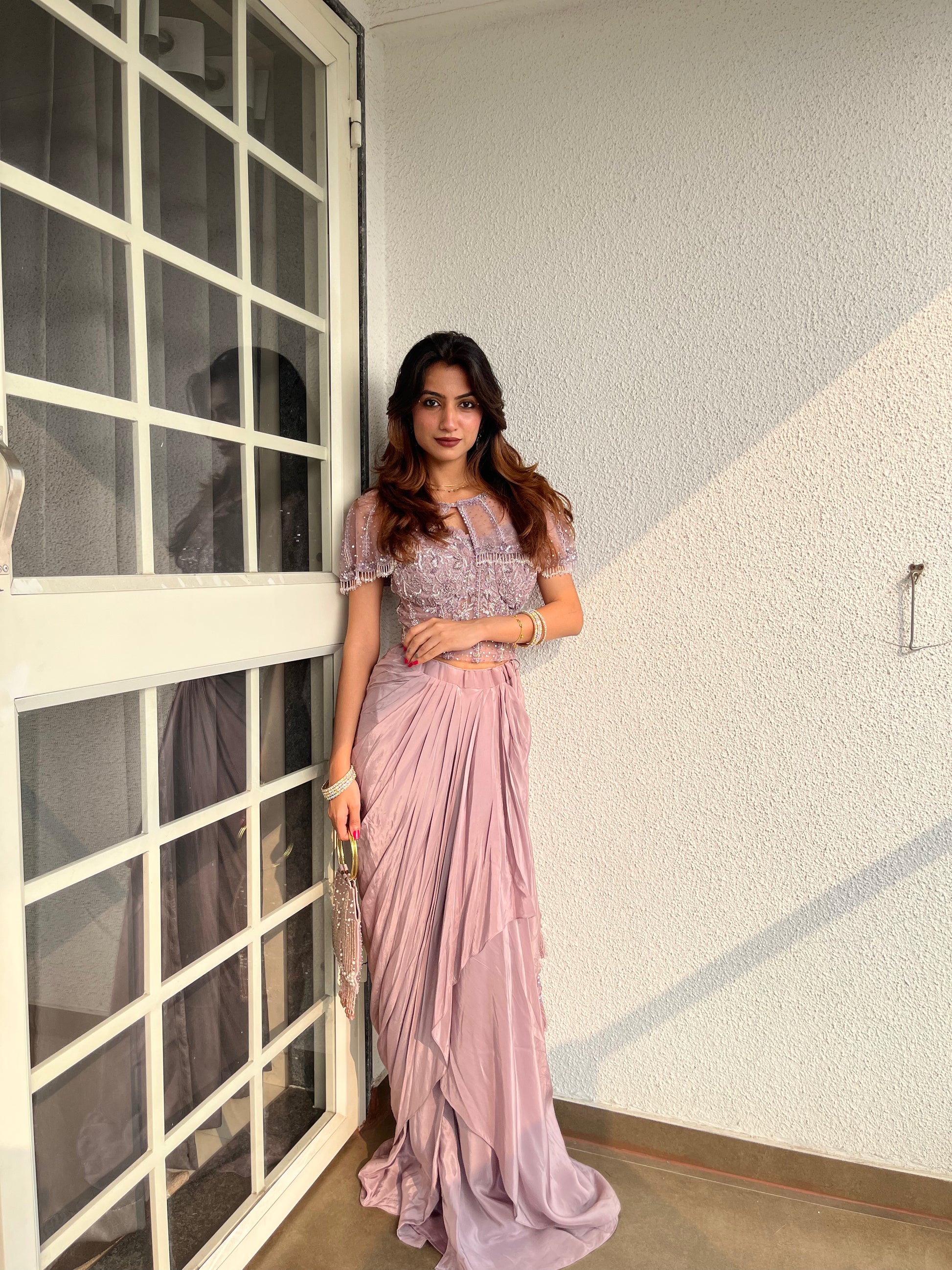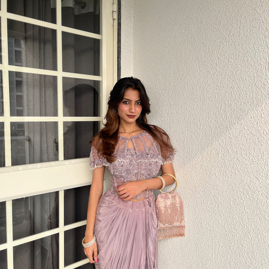 Panna Metallic Mauve Net Indo Western Set With Saree Style Skirt (Ft:-Samiksha Thombare)