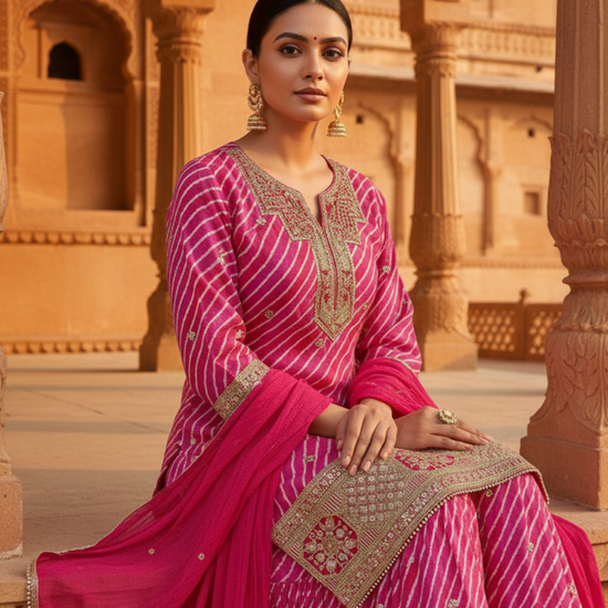 Step into effortless elegance with this readymade Sharara crafted from soft, breathable Cotton fabric, perfect for all-day comfort and style. The ensemble features a traditional Bandhani print that adds a vibrant ethnic charm, beautifully enhanced with Bead work, delicate Sequence accents, and fine Thread embroidery. Ideal for festive gatherings, casual celebrations, or daytime occasions, this outfit combines timeless craftsmanship with a touch of modern grace — making it a versatile addition to your wardrobe.