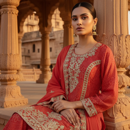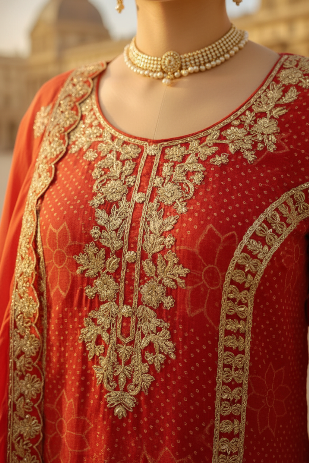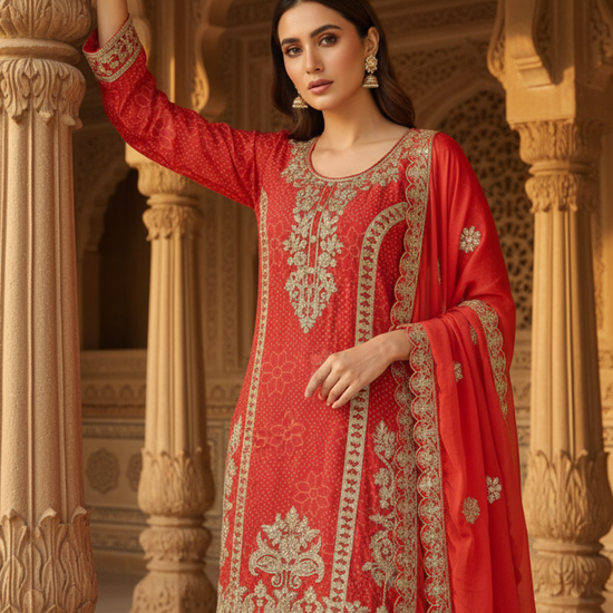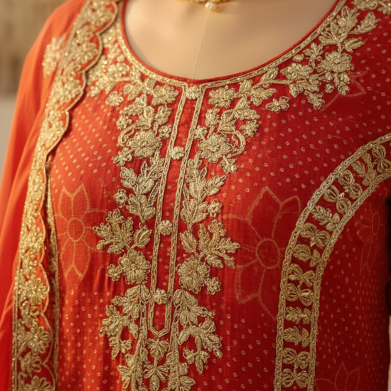 Embrace graceful tradition with this readymade suit crafted from soft, flowy Chinon fabric, offering a luxurious drape and refined sheen. The ensemble features a beautiful Bandhani print that reflects timeless ethnic artistry, enhanced with shimmering Sequence work and intricate Zari Thread embroidery. Perfect for festive occasions, family gatherings, and cultural celebrations, this outfit blends traditional charm with contemporary sophistication — a perfect balance of comfort and elegance.