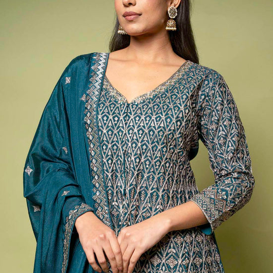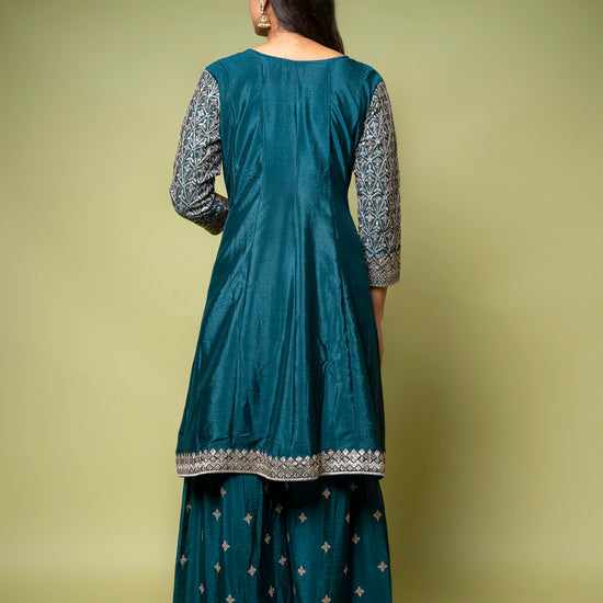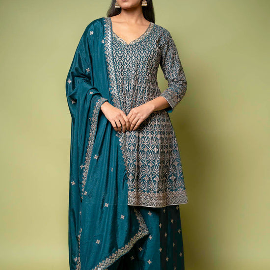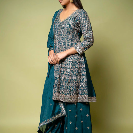 Panna Bottle Green Chinon Readymade Sharara Set With Chinon Dupatta