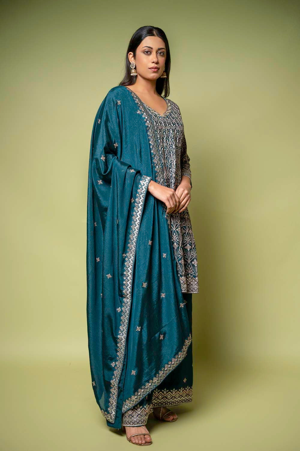 Made with Bead work, Cutdana, Dabka work, Sequence work, Thread work, Zari thread work on premium Chinon, this ready-made suit is ideal for Formal Occasion. Its timeless design and Color Variations make it a standout. Its pre-stitched design offers ease and sophistication. Preserve with Dry Wash / Dry Clean.