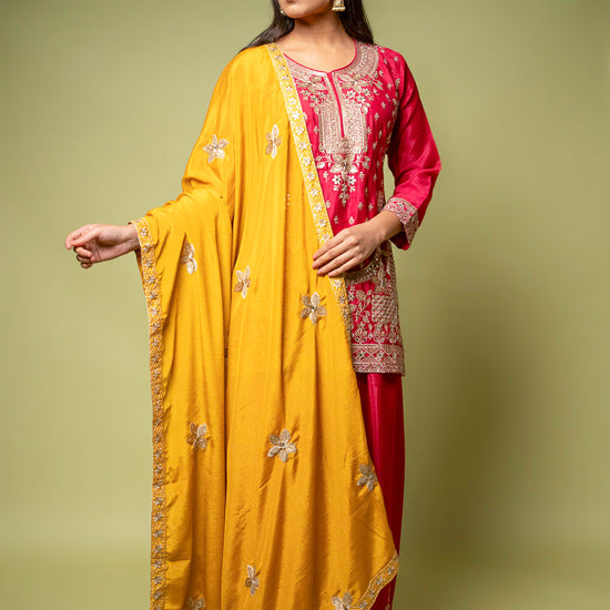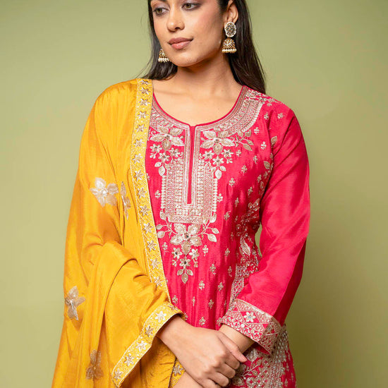 Made with Mirror, Sequence, Zarkan & Zari thread work on premium Chinon, this ready-made suit is ideal for Formal Occasion. Its timeless design and Color Variations make it a standout. Its pre-stitched design offers ease and sophistication. Preserve with Dry Wash / Dry Clean.