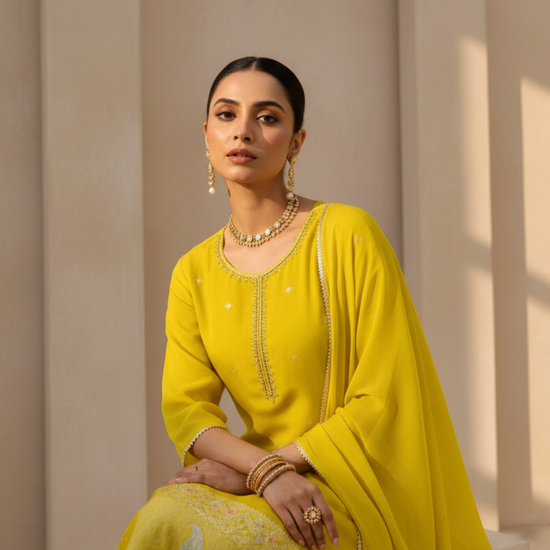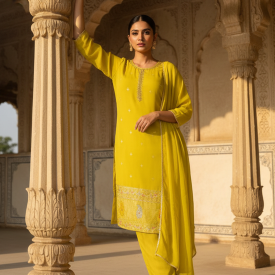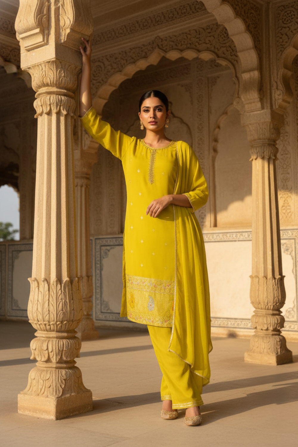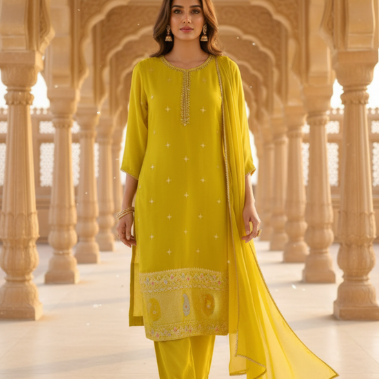 Exude timeless elegance with this readymade suit crafted from premium Crepe fabric, known for its smooth texture and graceful drape. The ensemble is exquisitely adorned with Bead work, Cutdana work, Mirror accents, shimmering Sequence embellishments, and fine Thread embroidery, beautifully complemented by Woven Zari and intricate Zari Thread work. Each detail reflects exquisite craftsmanship and refined artistry, making this outfit perfect for weddings, festive occasions, and grand celebrations. A flawless blend of tradition and contemporary sophistication, this suit captures the essence of modern ethnic luxury.