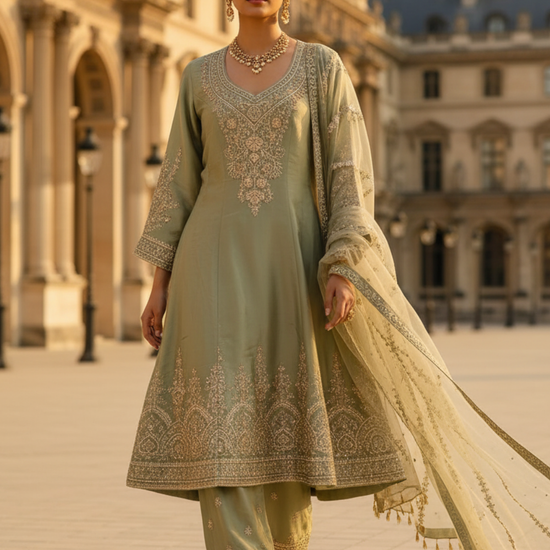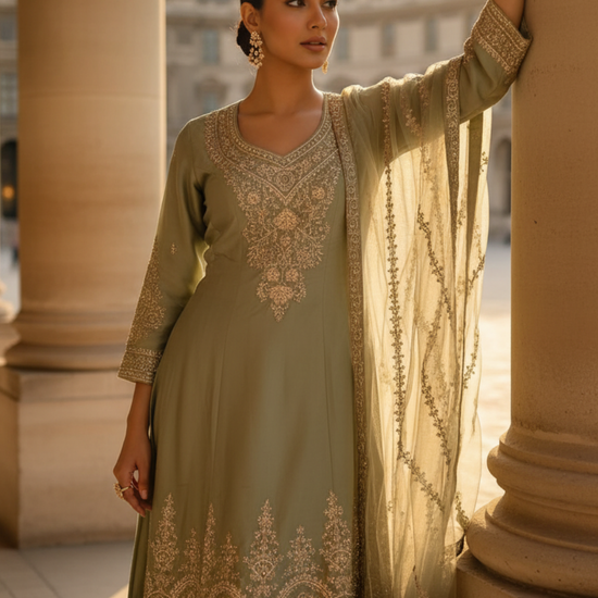 Match with : Embroidered juttis, mojris, or block heels in gold or nude tones.