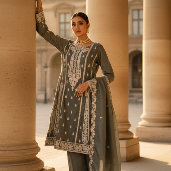 Exude understated elegance with this readymade Sharara crafted from premium Chinon fabric, loved for its smooth texture and fluid drape. The ensemble is adorned with shimmering Sequence work and intricate Zari Thread embroidery, creating a perfect balance of traditional charm and modern sophistication. Ideal for festive occasions, weddings, and special celebrations, this outfit radiates refined grace and timeless beauty.