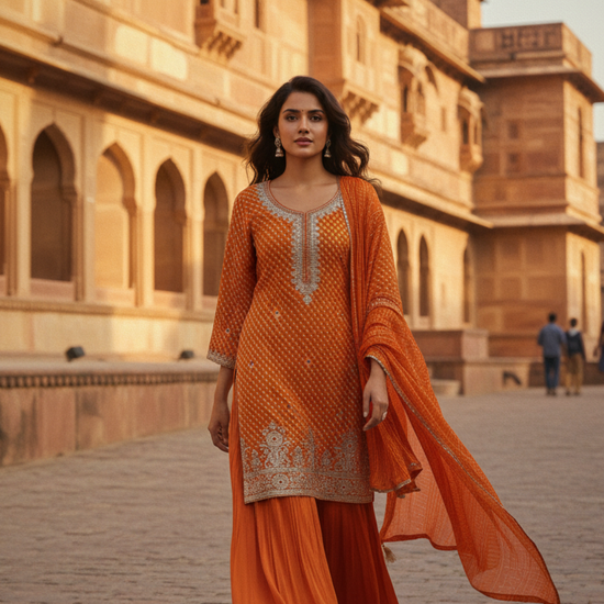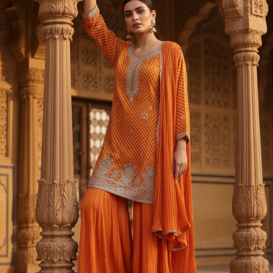 Panna Orange Chinon Readymade Sharara Set With Chinon Dupatta