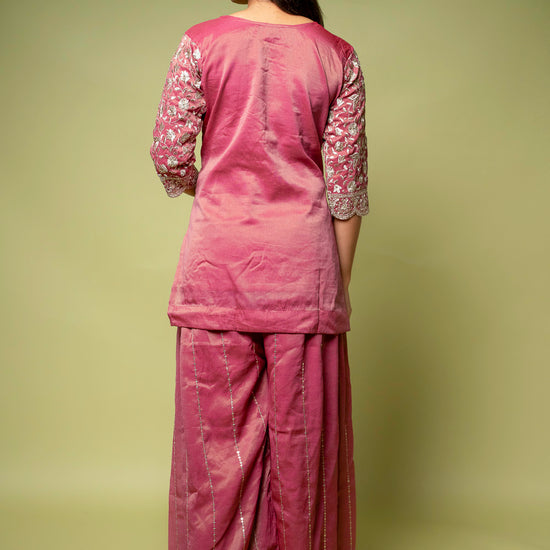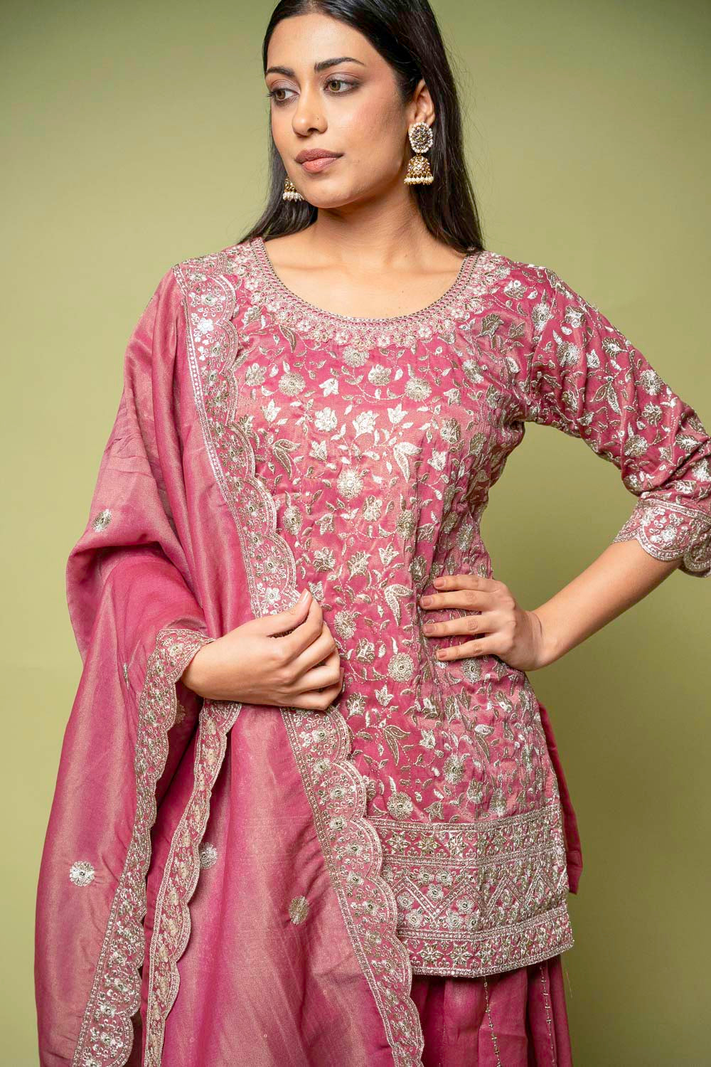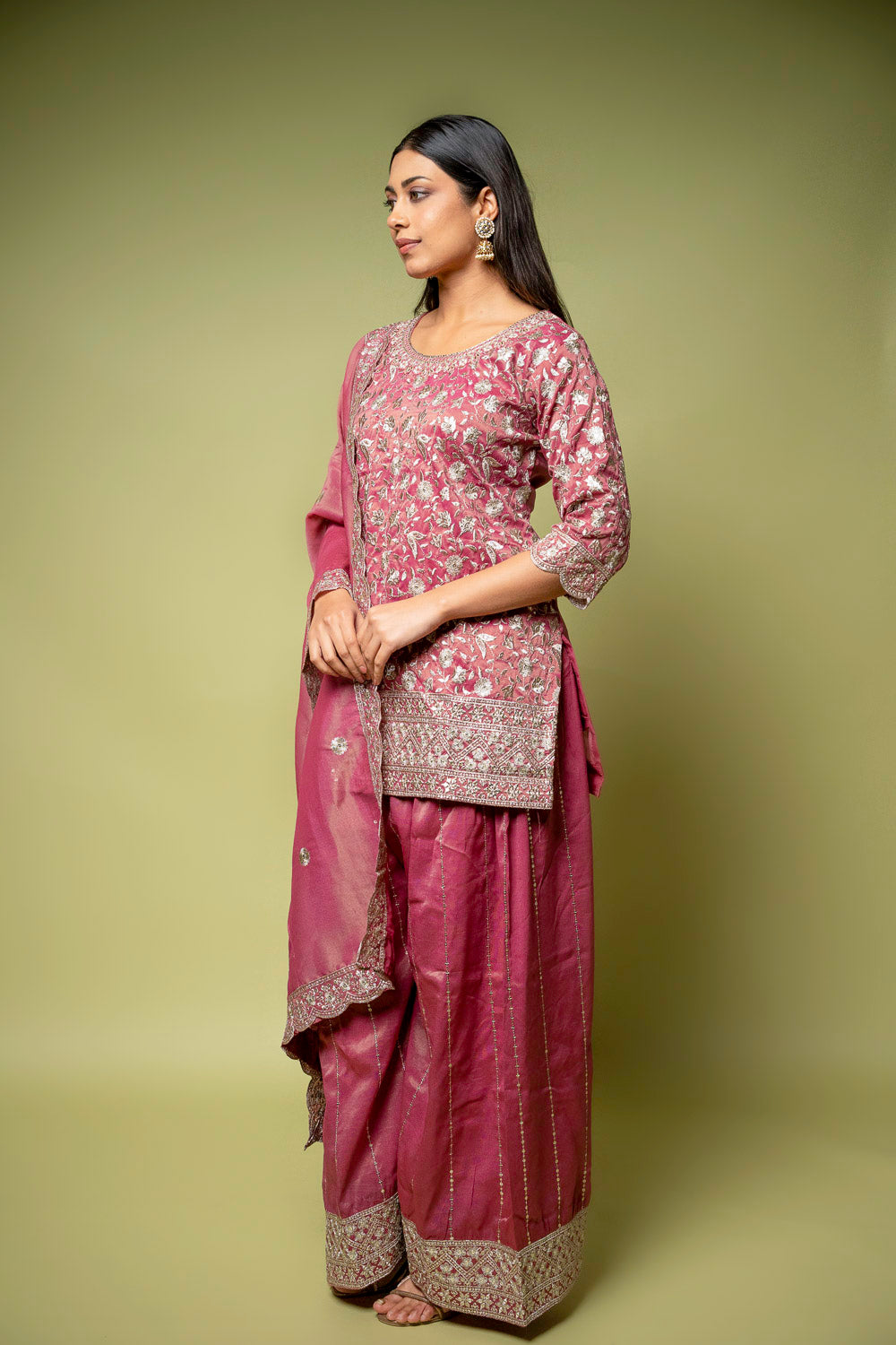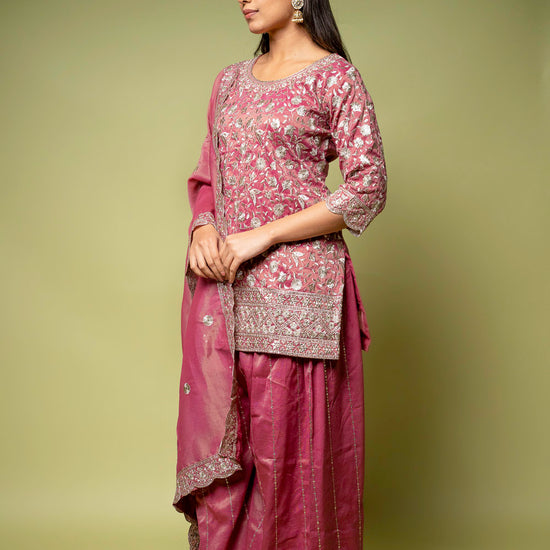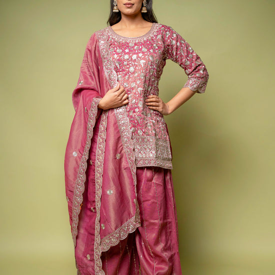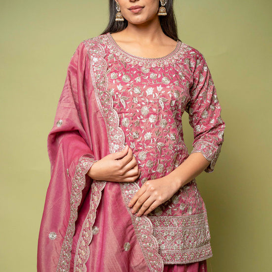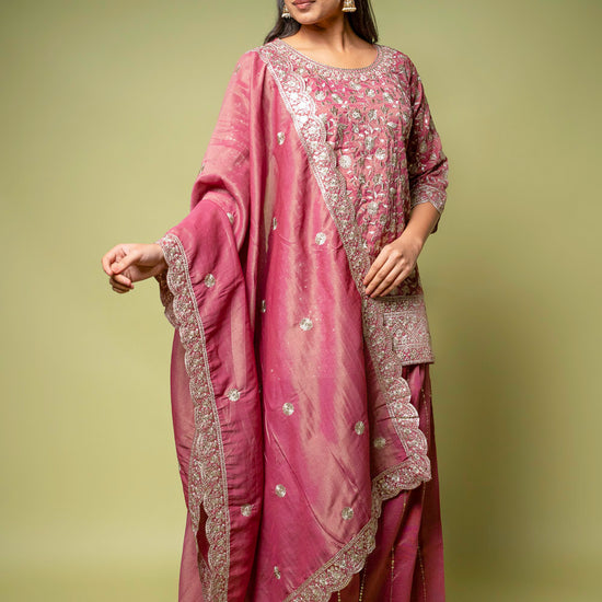 Designed with Sequence & Zari Threadwork, this Foil Tissue ready-made suit is perfect for Formal Occasion. Its Lightweight finish ensures effortless elegance. Dry Wash / Dry Clean recommended.