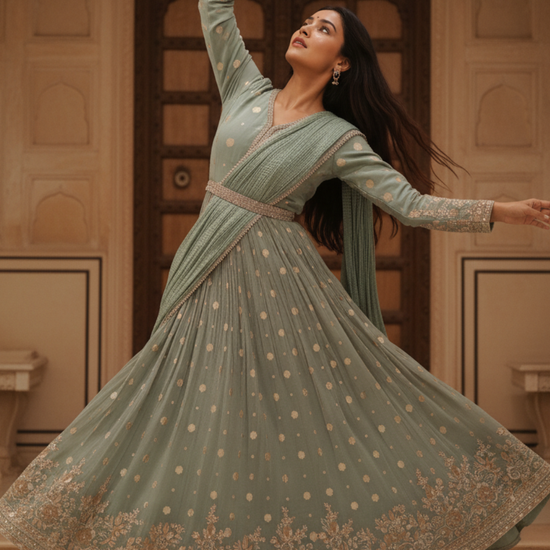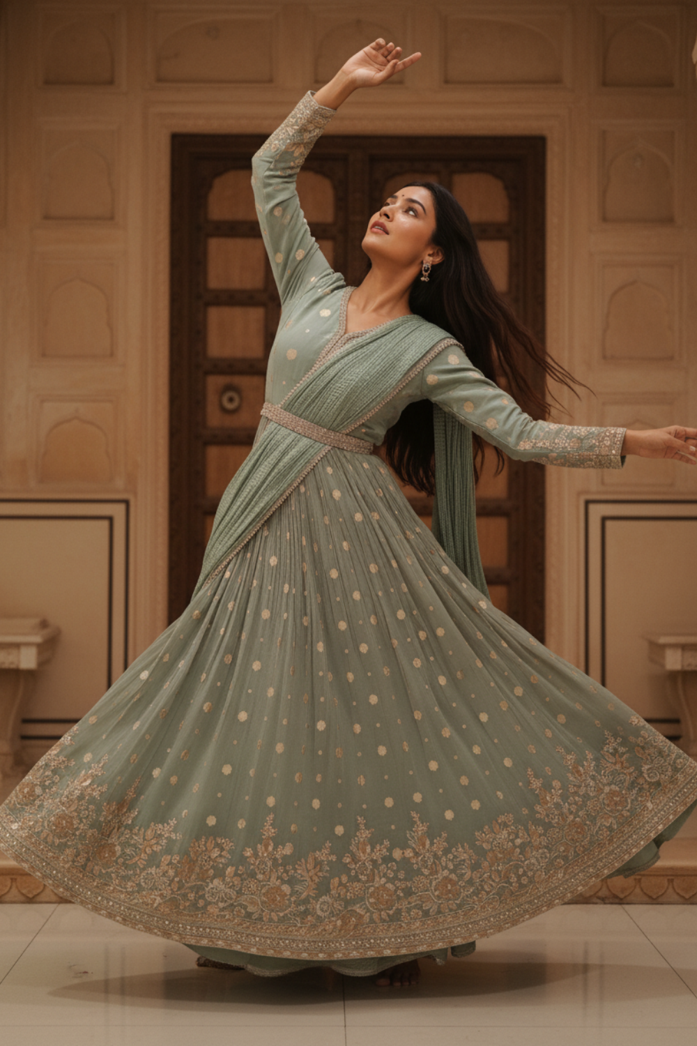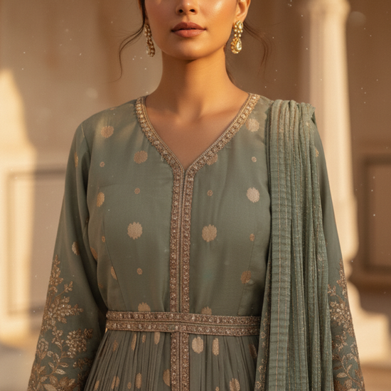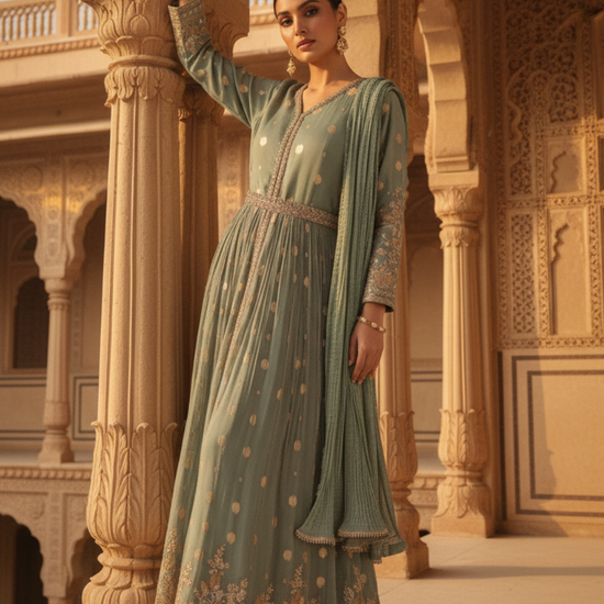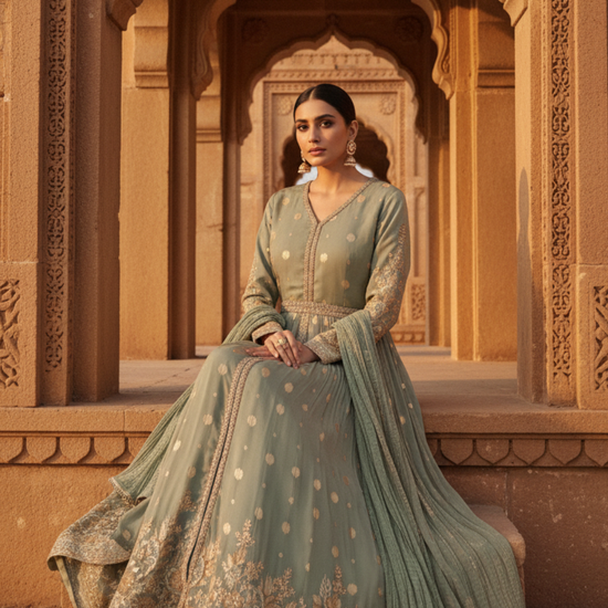 Sea Green Tissue Floor Length Readymade Suit And Pant With Chinon Dupa – The Panna Shop