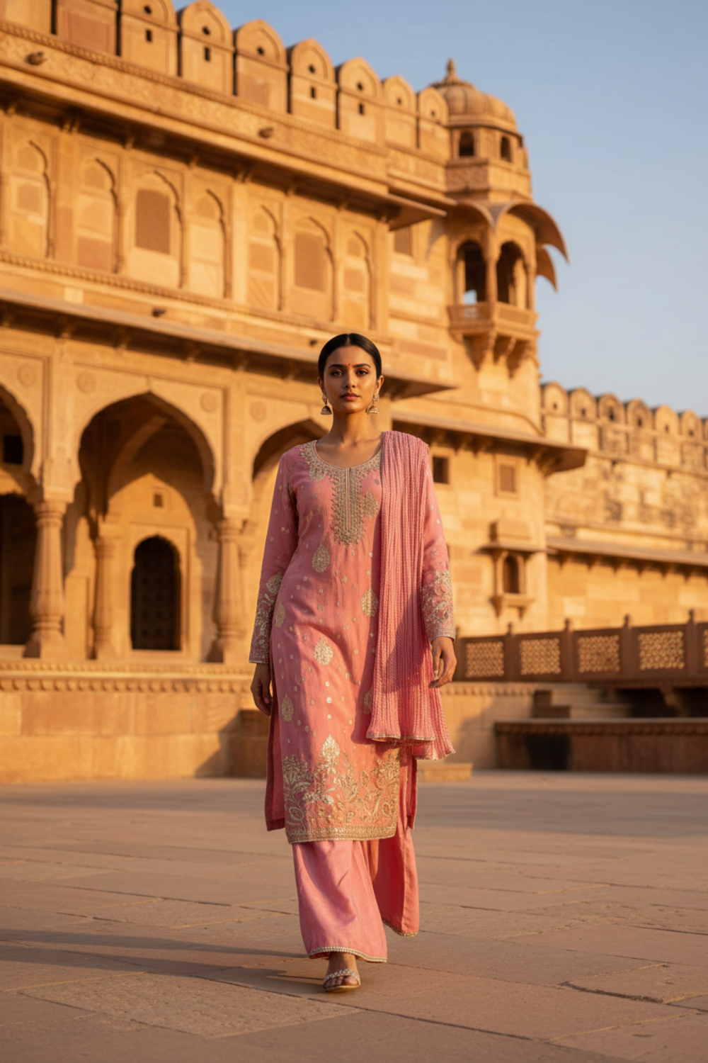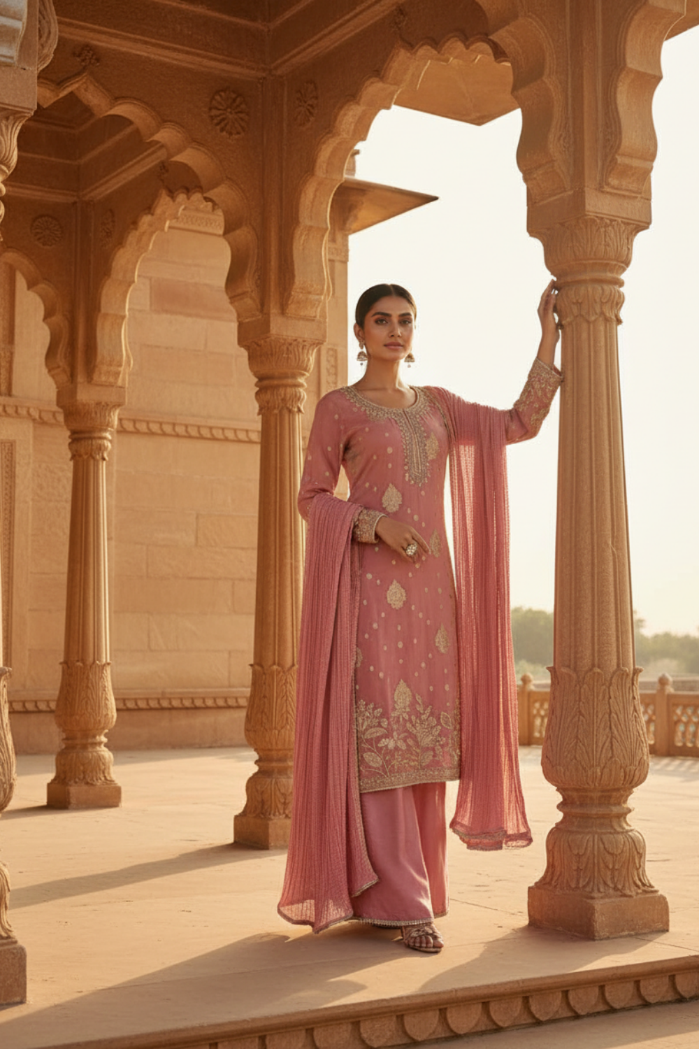 Panna Gajari Chinon Readymade Suit And Palazzo With Chinon Dupatta
