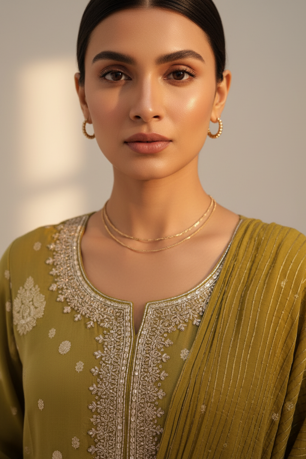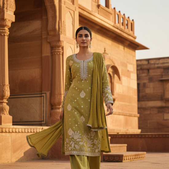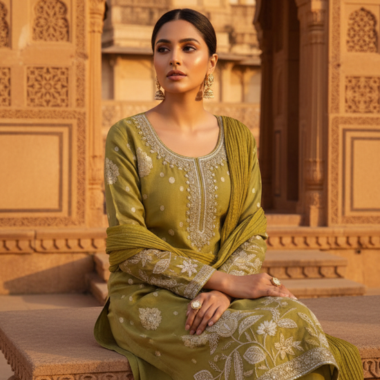 Featuring Banarasi Woven Zari, Bead, Cutdana, Dabka, Sequence & Zari Threadwork, this Chinon suit is crafted for Formal Occasion. Its Color Variations and pre-stitching make it a go-to option. Dry Wash / Dry Clean recommended.