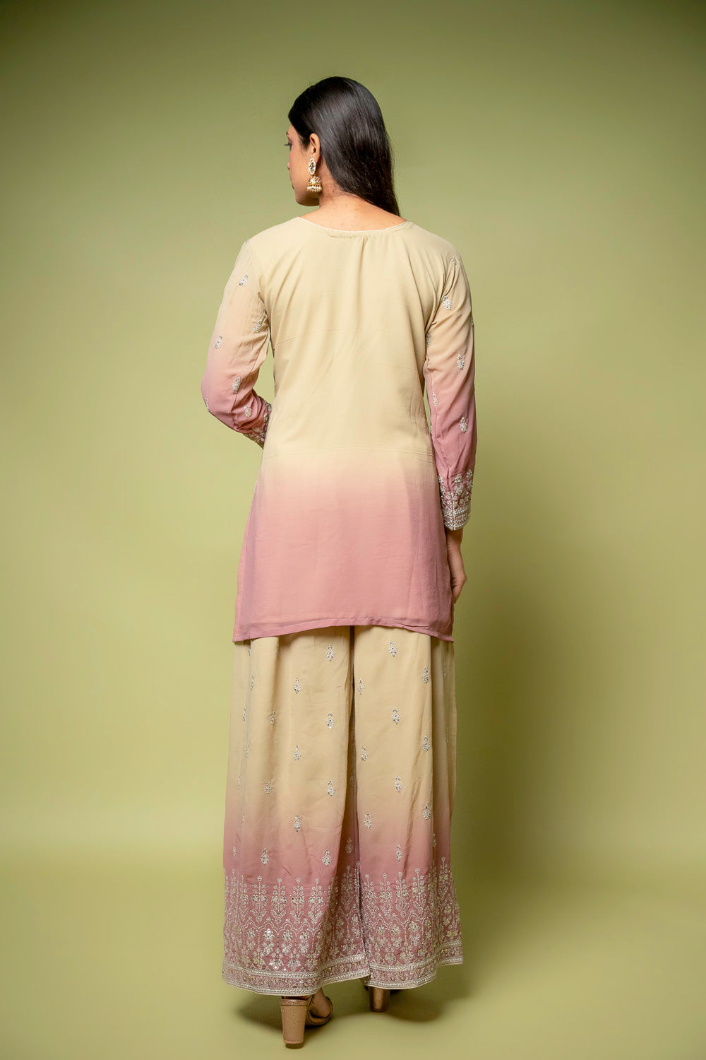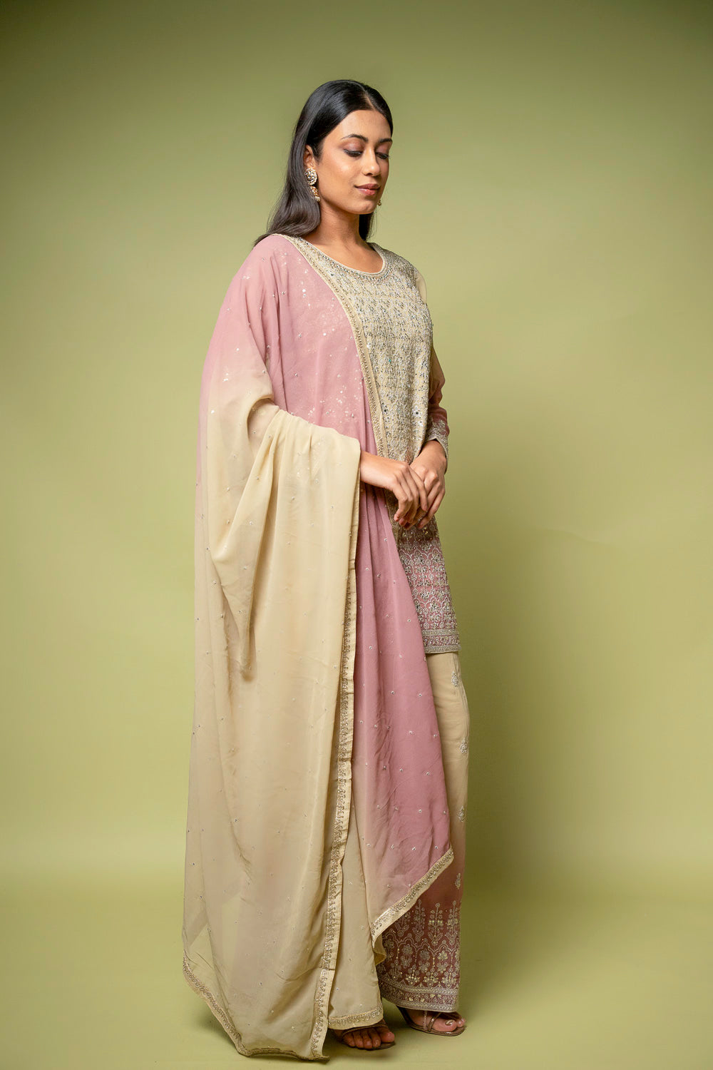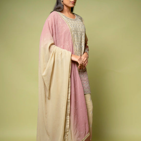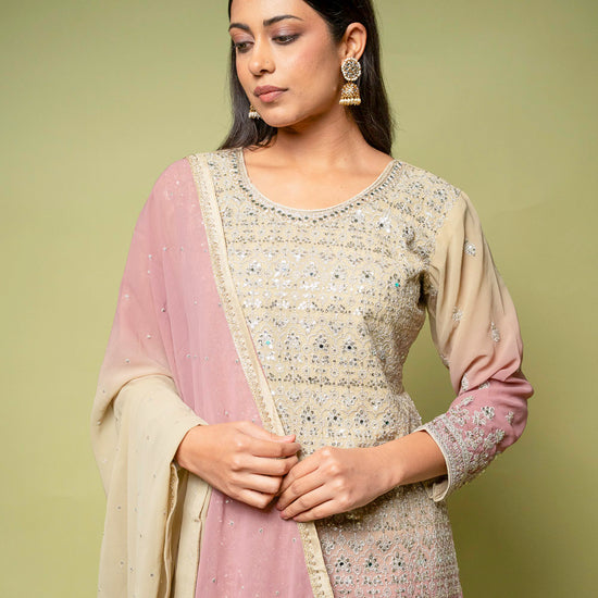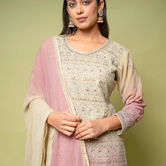 Designed with Mirror, Sequence & Zari threadwork, this Georgette ready-made suit is perfect for Formal Occasion. Its Lightweight finish ensures effortless elegance. Dry Wash / Dry Clean recommended.