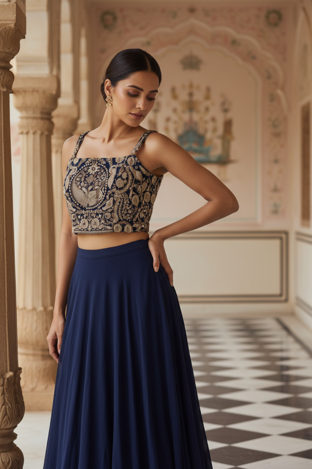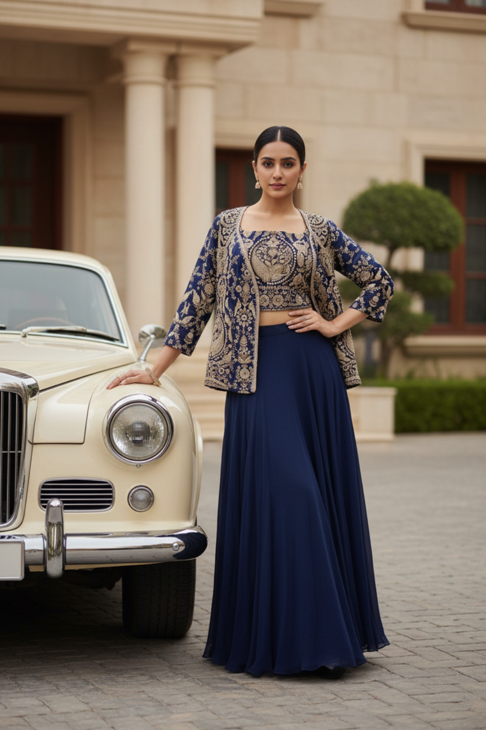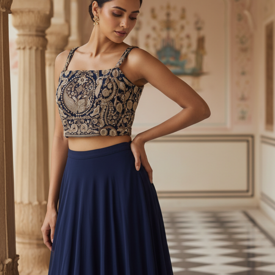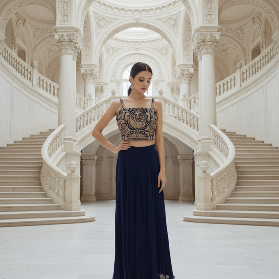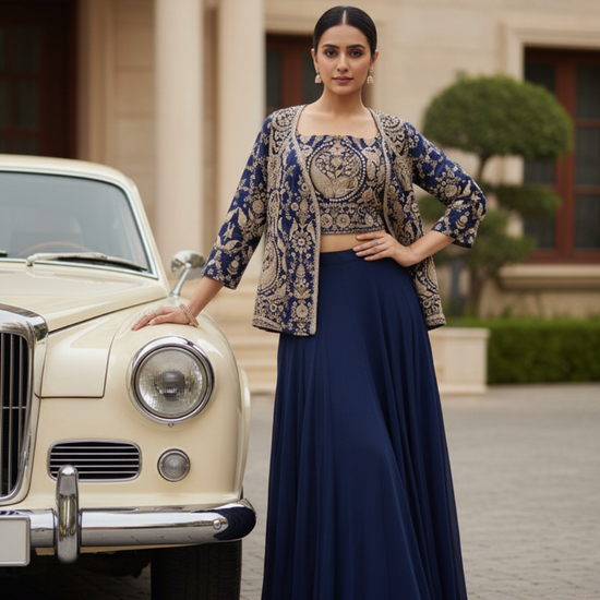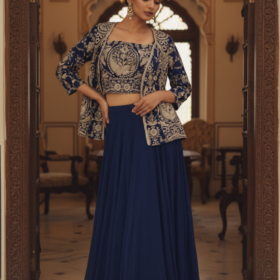 Panna Navy Blue Georgette Readymade Short Top Sharara Set With Shrug