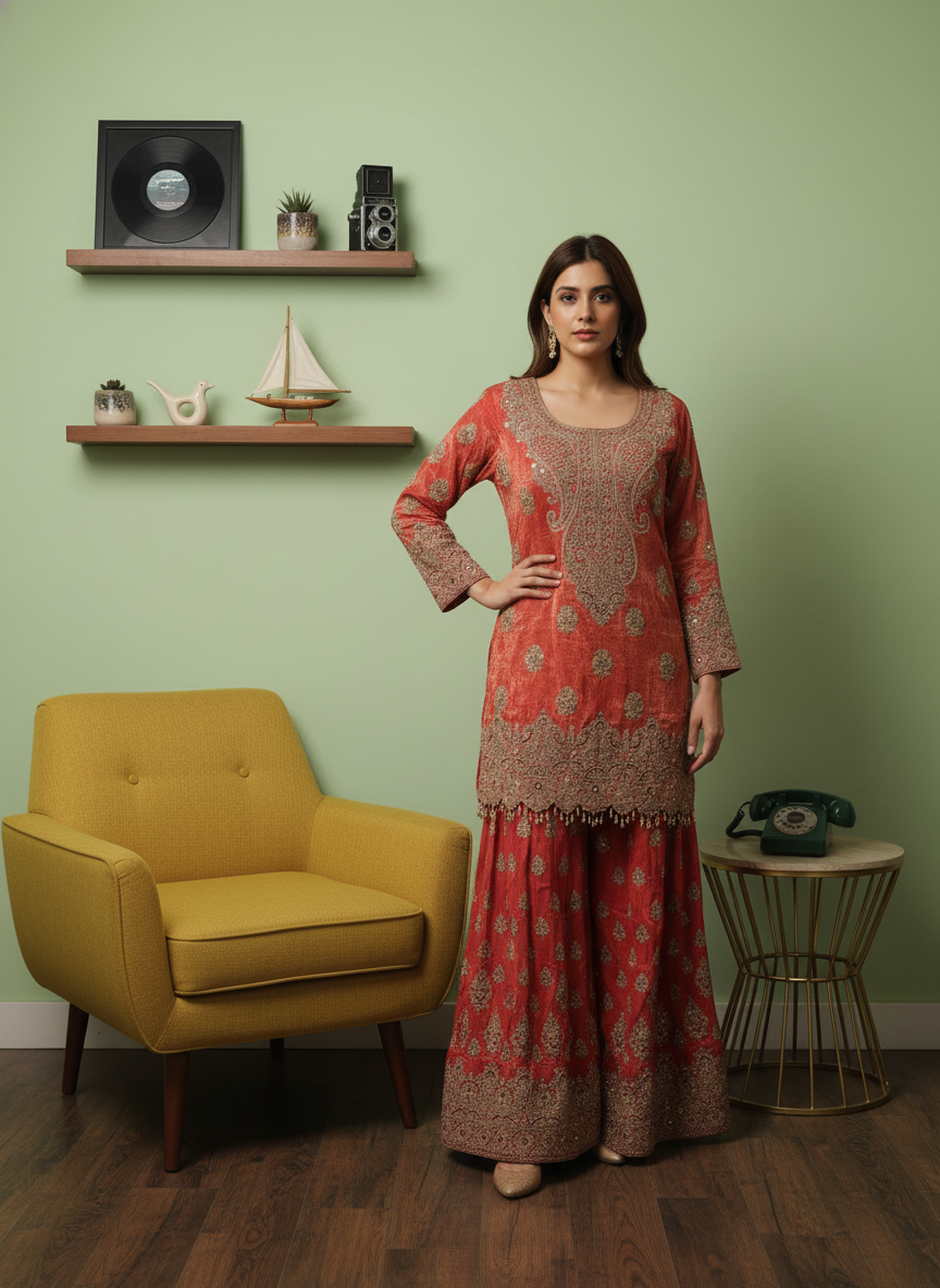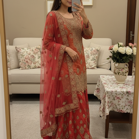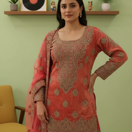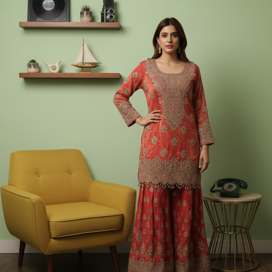 Crafted from Shimmer, this ready-made suit features Bead, Cutdana, Dabka, Mirror, Sequence, Zarkan & Zari Thread Work and is perfect for Formal Occasion. Its Heavy design ensures comfort and style. Follow Dry Wash / Dry Clean.