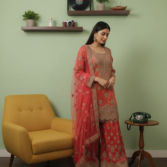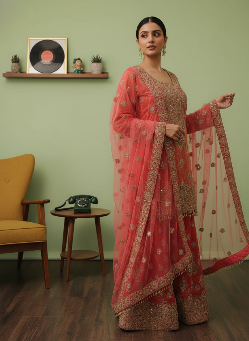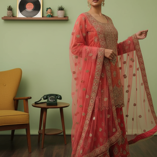 Panna Dark Gajari Shimmer Readymade Sharara Set With Net Dupatta