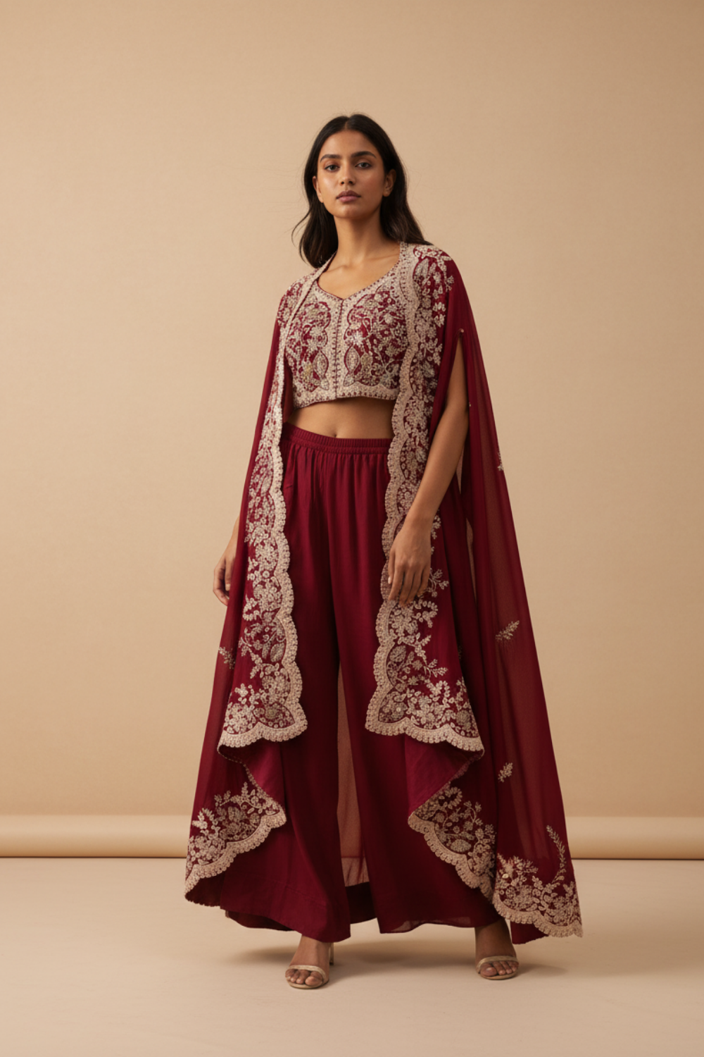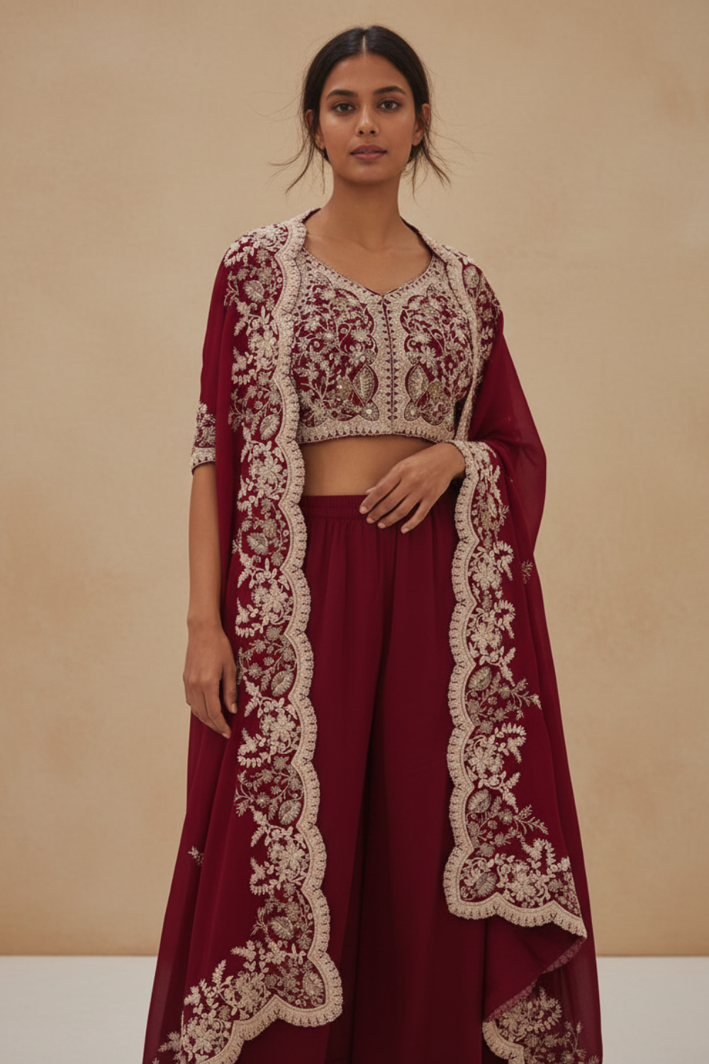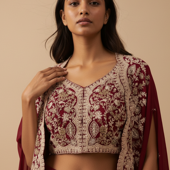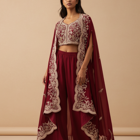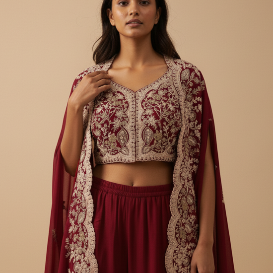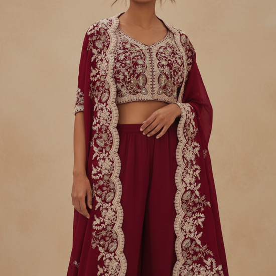 Maroon Dola Readymade and Sharara Set With Shrug – The Panna Shop