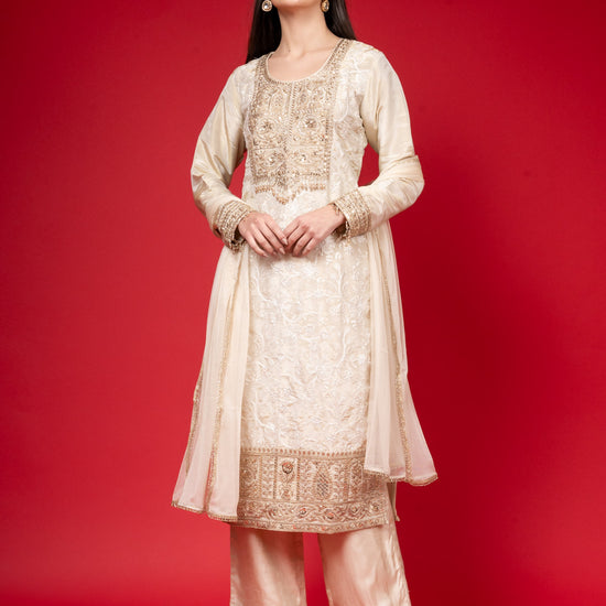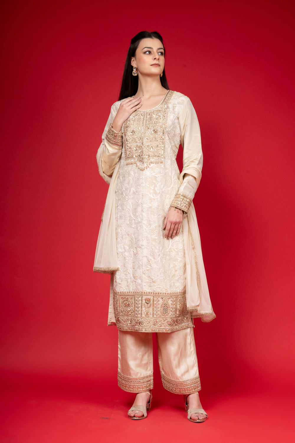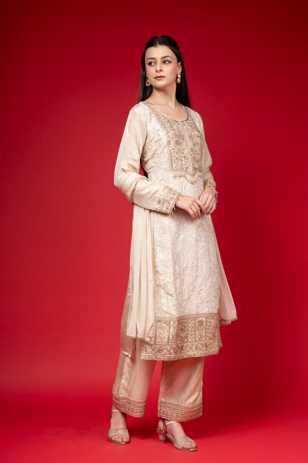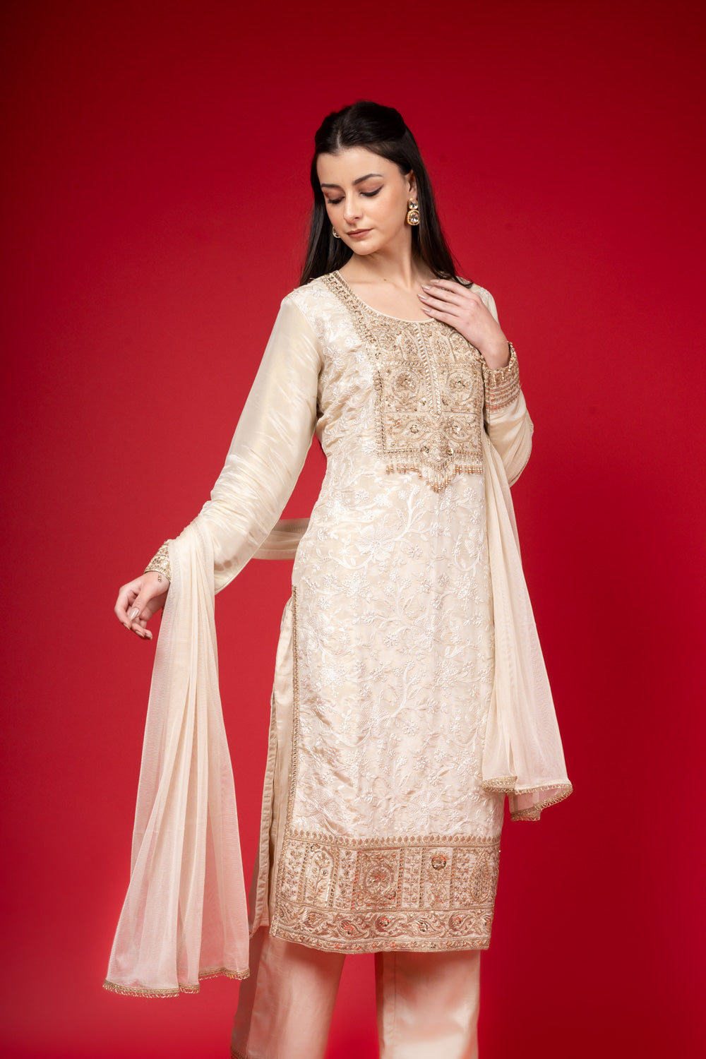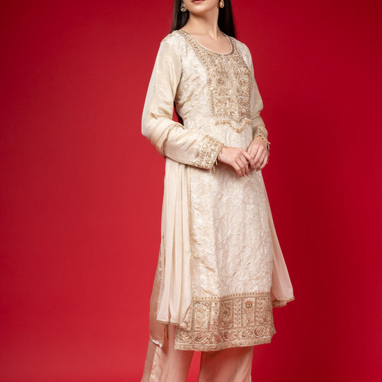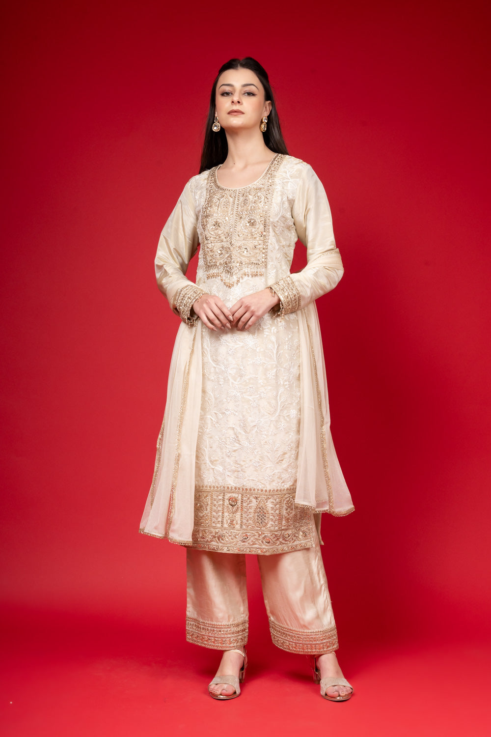 Panna Off White Tissue Readymade Suit And Pant With Net Dupatta