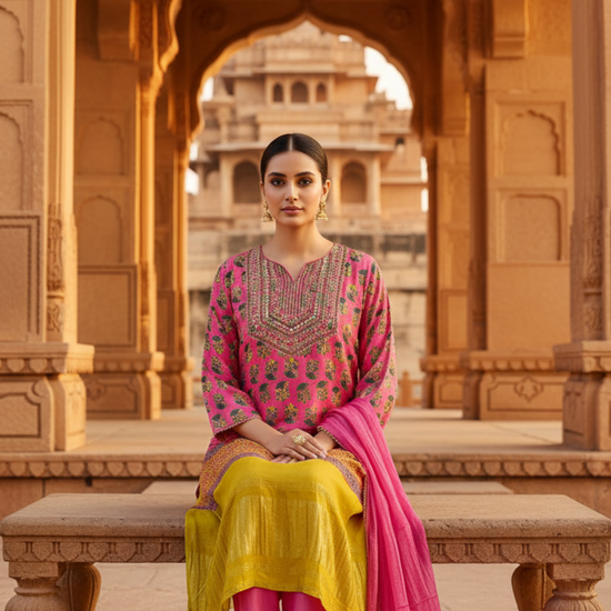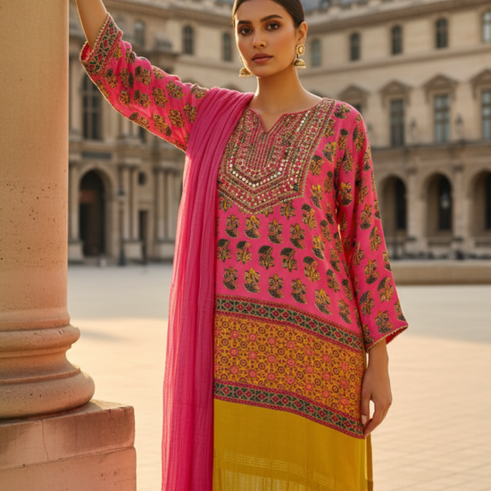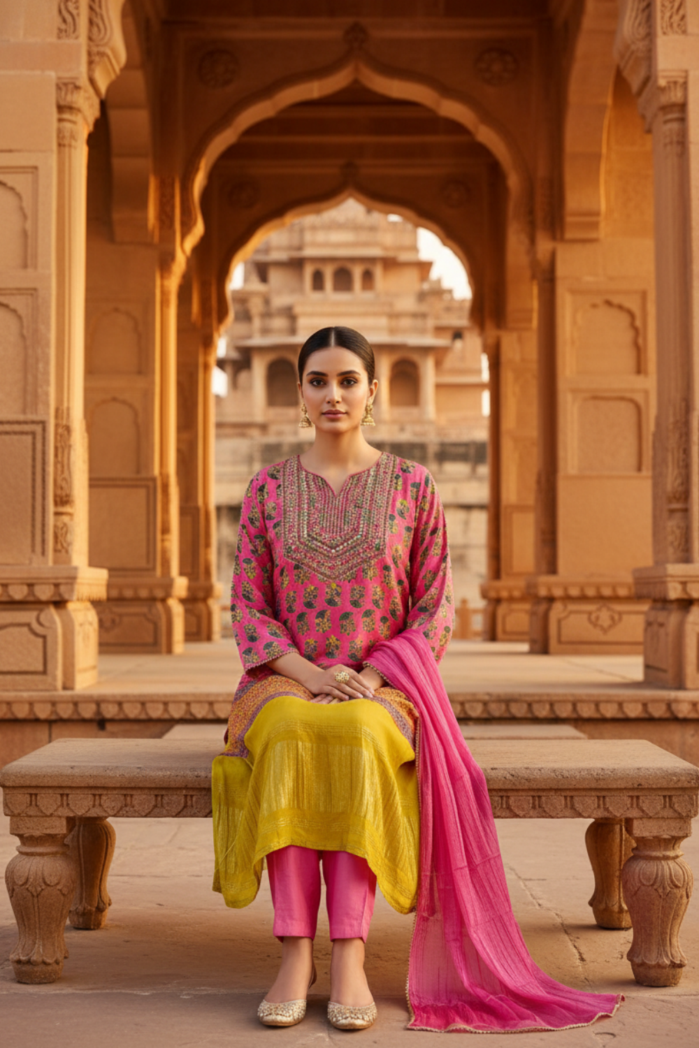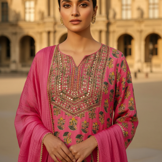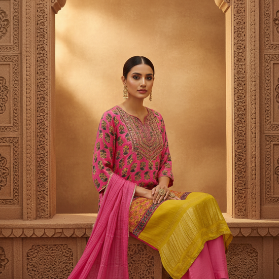 Timeless Elegance Rani Gajji Satin Readymade Suit And Pant With Chinon – The Panna Shop