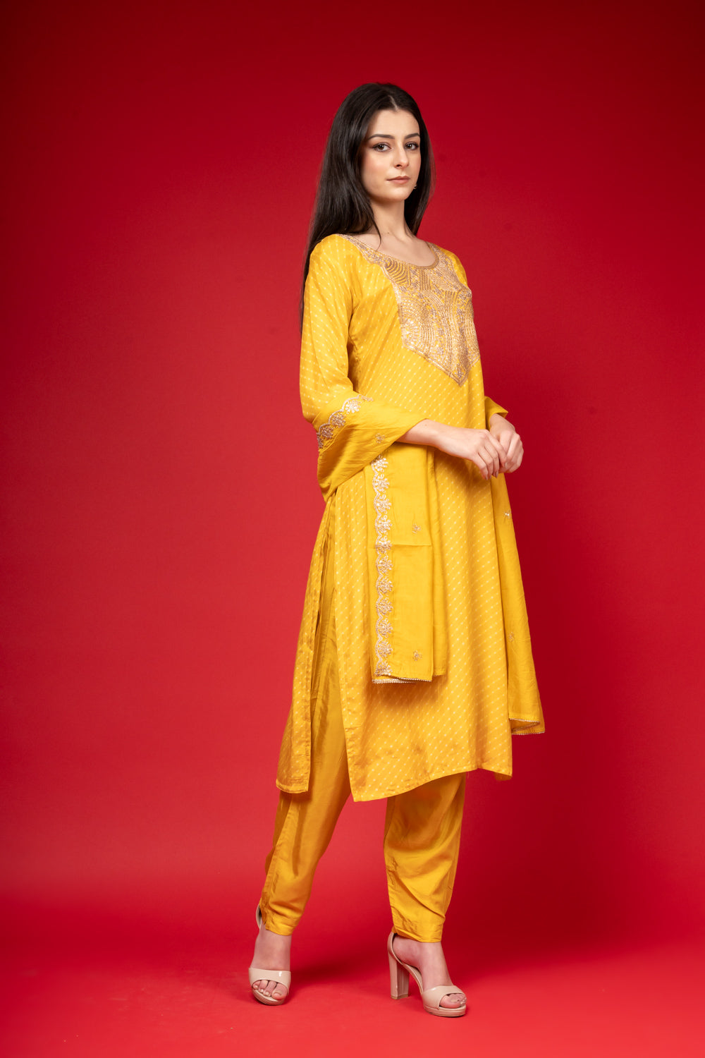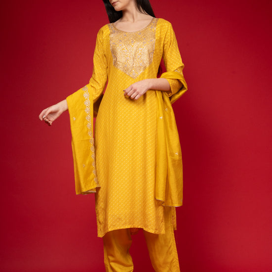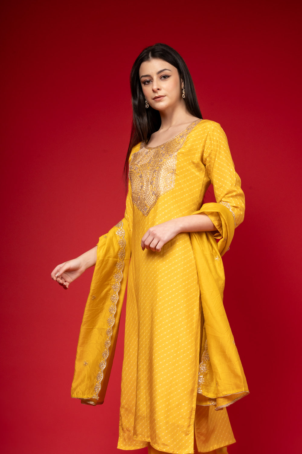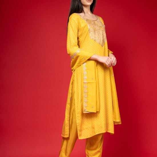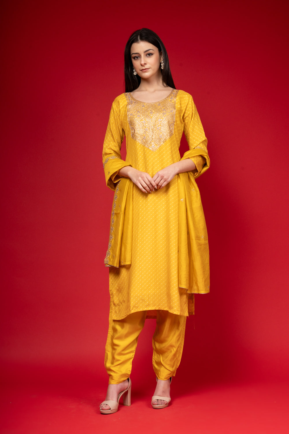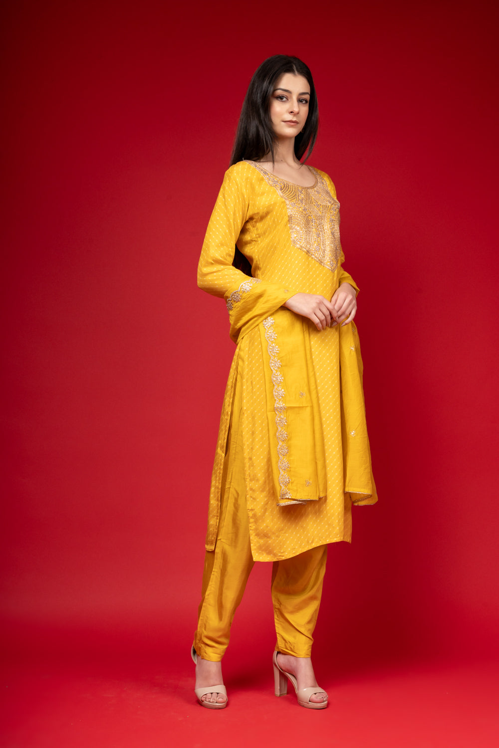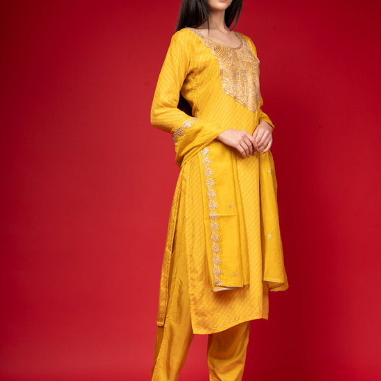 Panna Mango Gold Cotton Readymade Suit And Pant With Cotton Dupatta