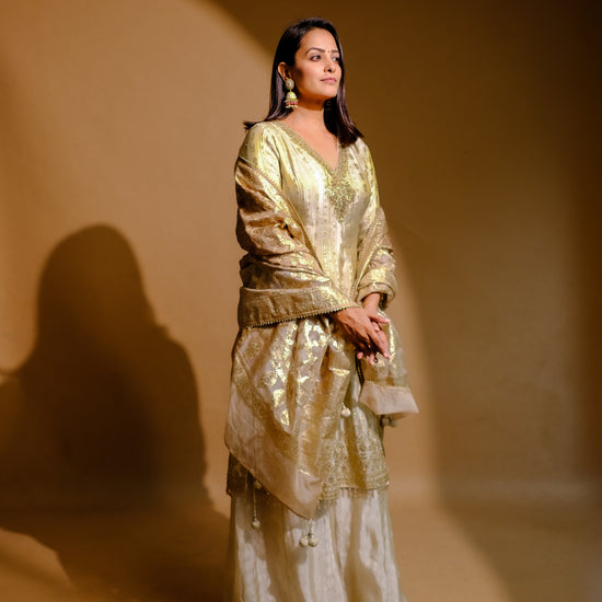 Panna Cream Tissue Readymade Suit And Palazzo With Organza Dupatta