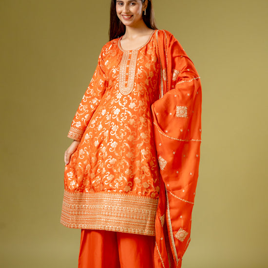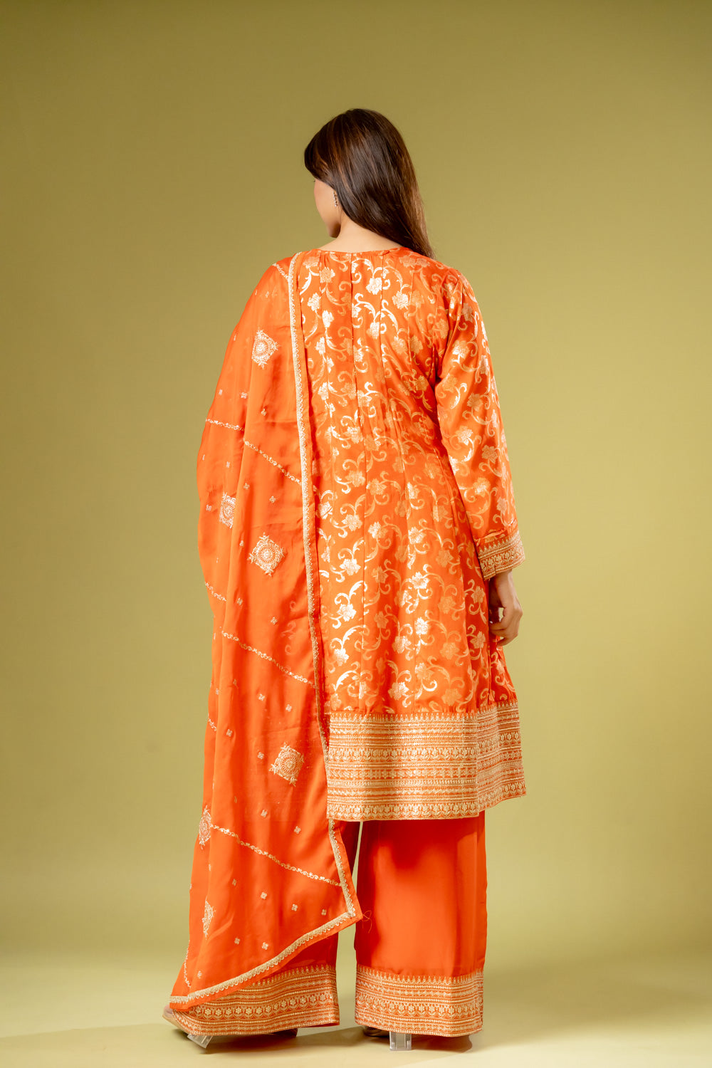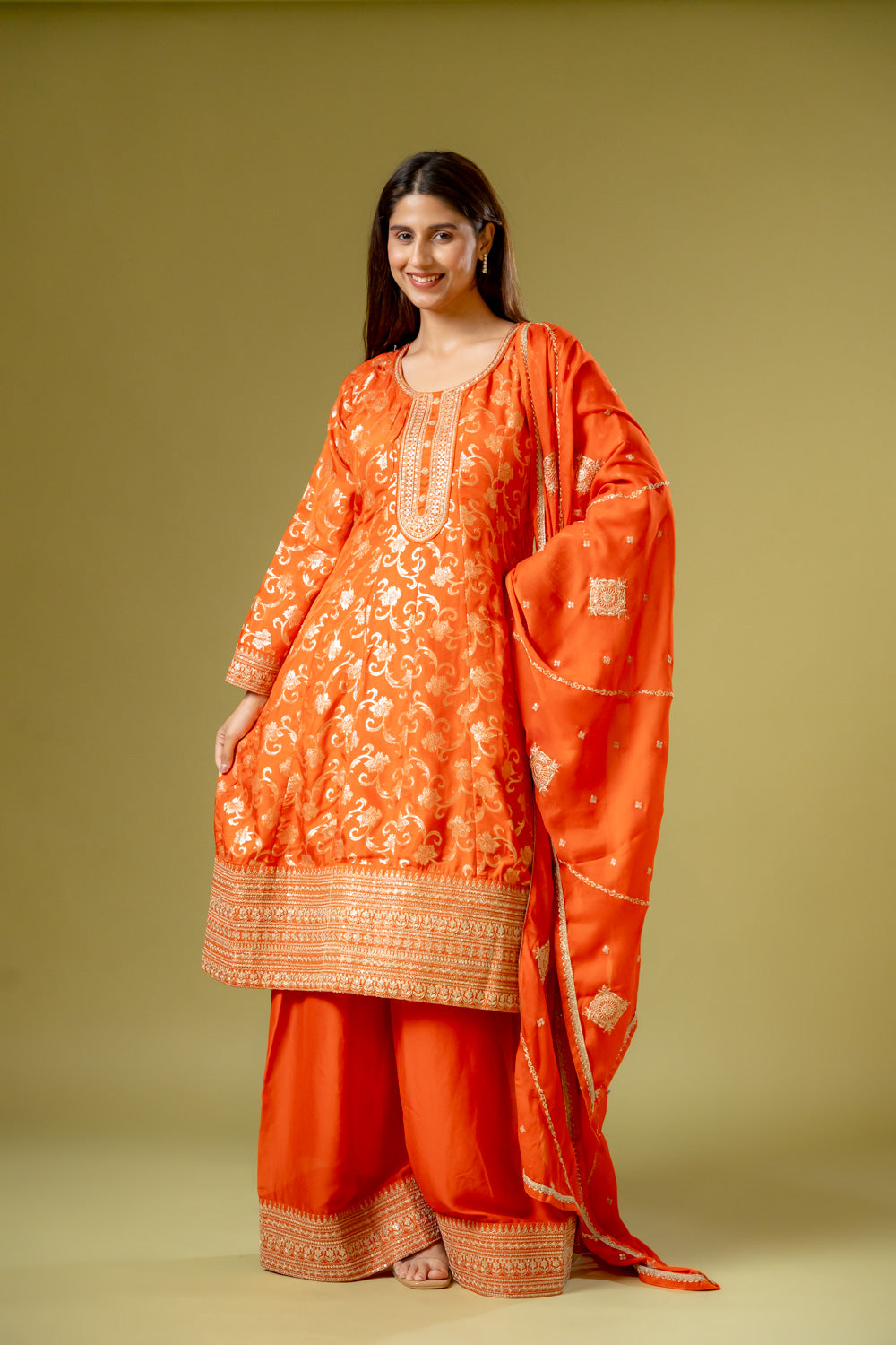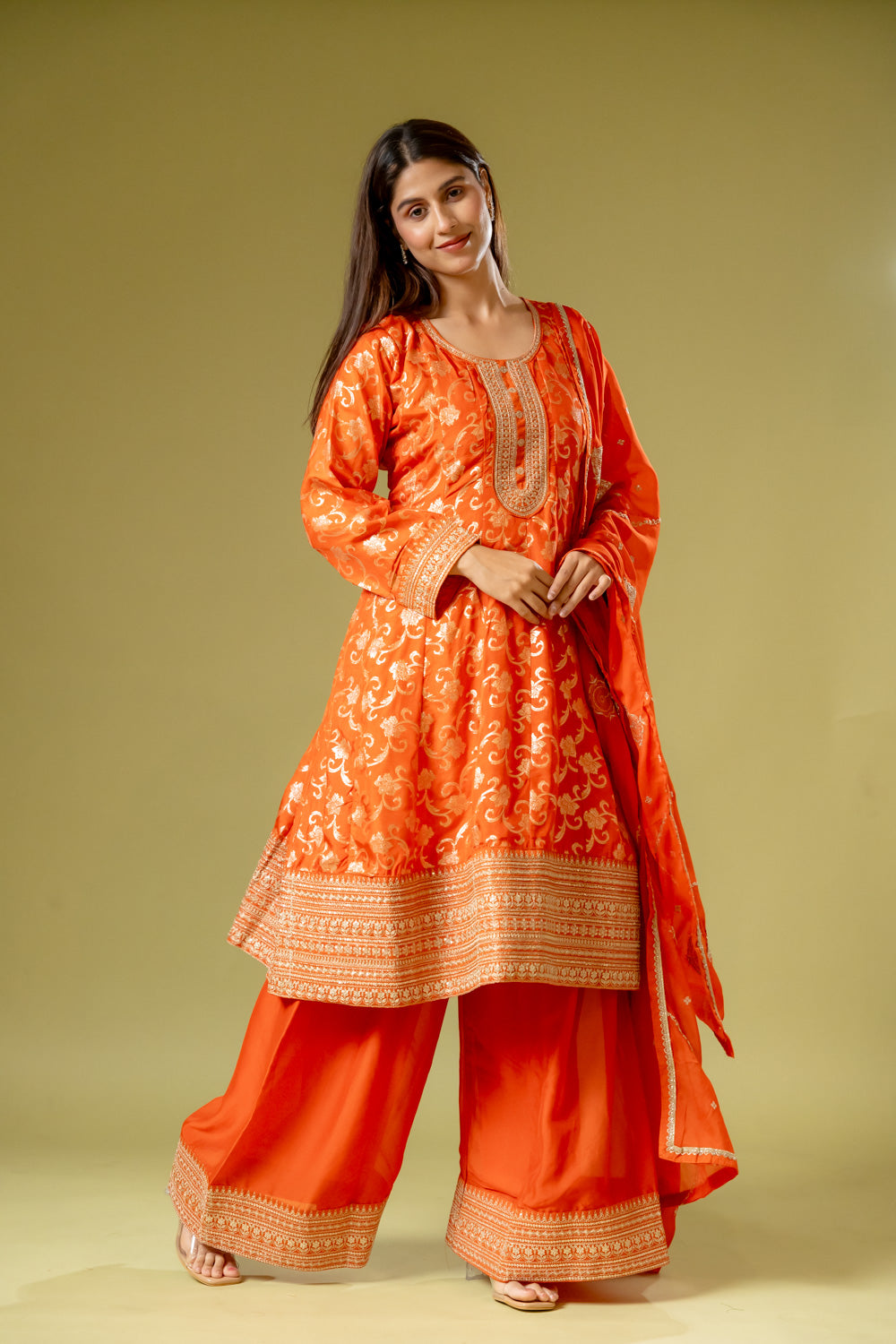 Panna Orange Georgette Readymade Suit And Palazzo With Georgette Dupatta