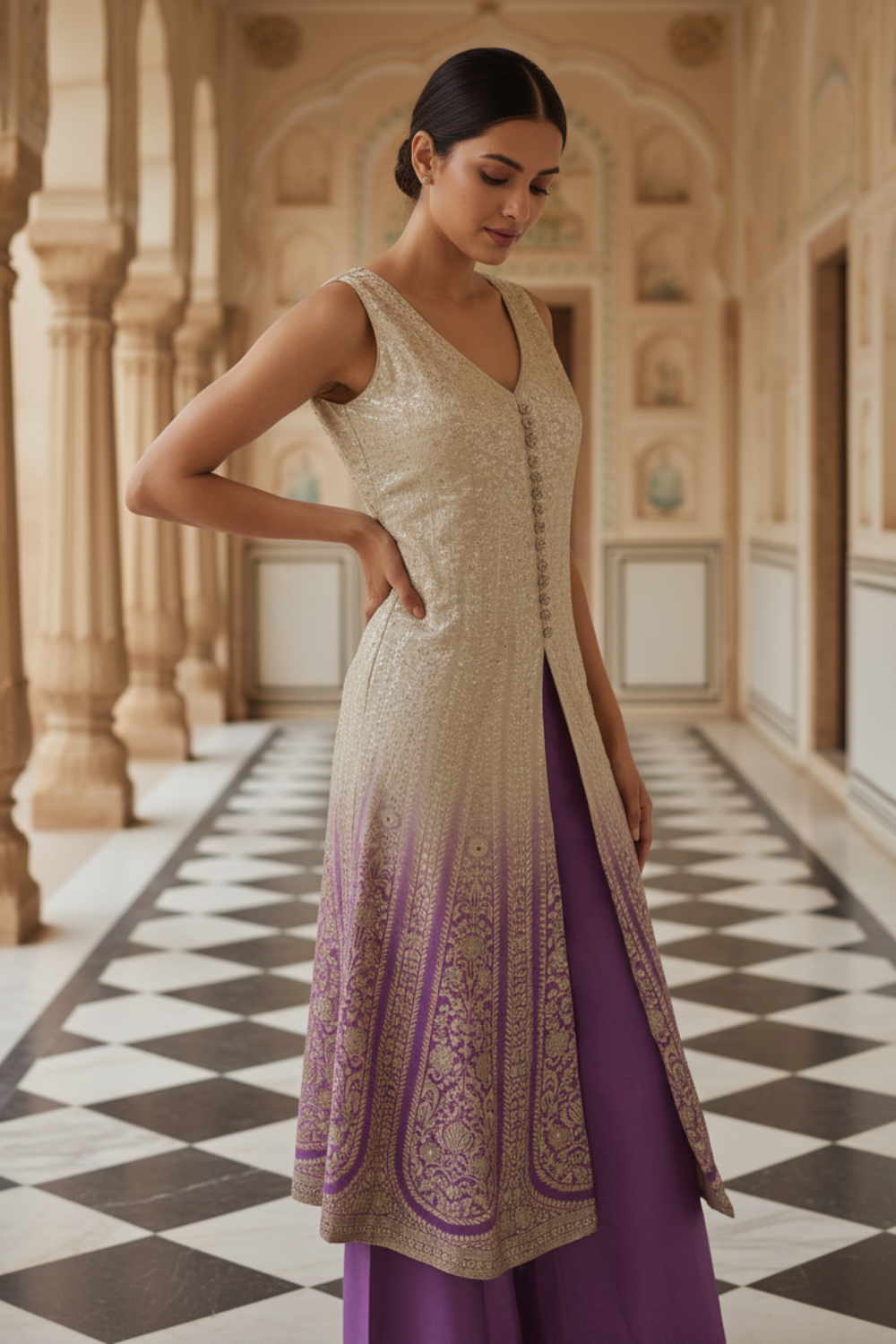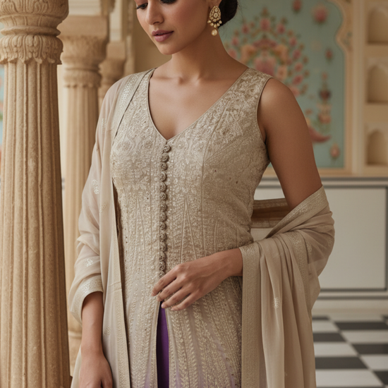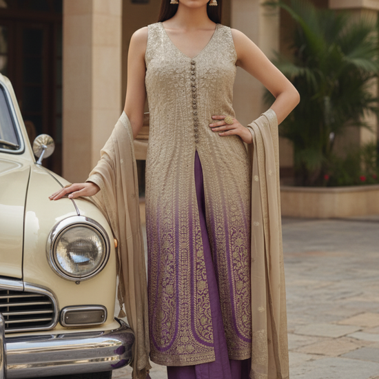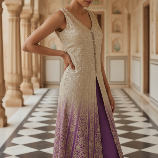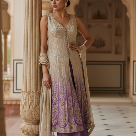 Made with Banarasi Woven Zari, Mirror & Swarovski on premium Loom, this ready-made suit is ideal for Formal Occasion. Its timeless design make it a standout. Its pre-stitched design offers ease and sophistication. Preserve with Dry Wash / Dry Clean.
