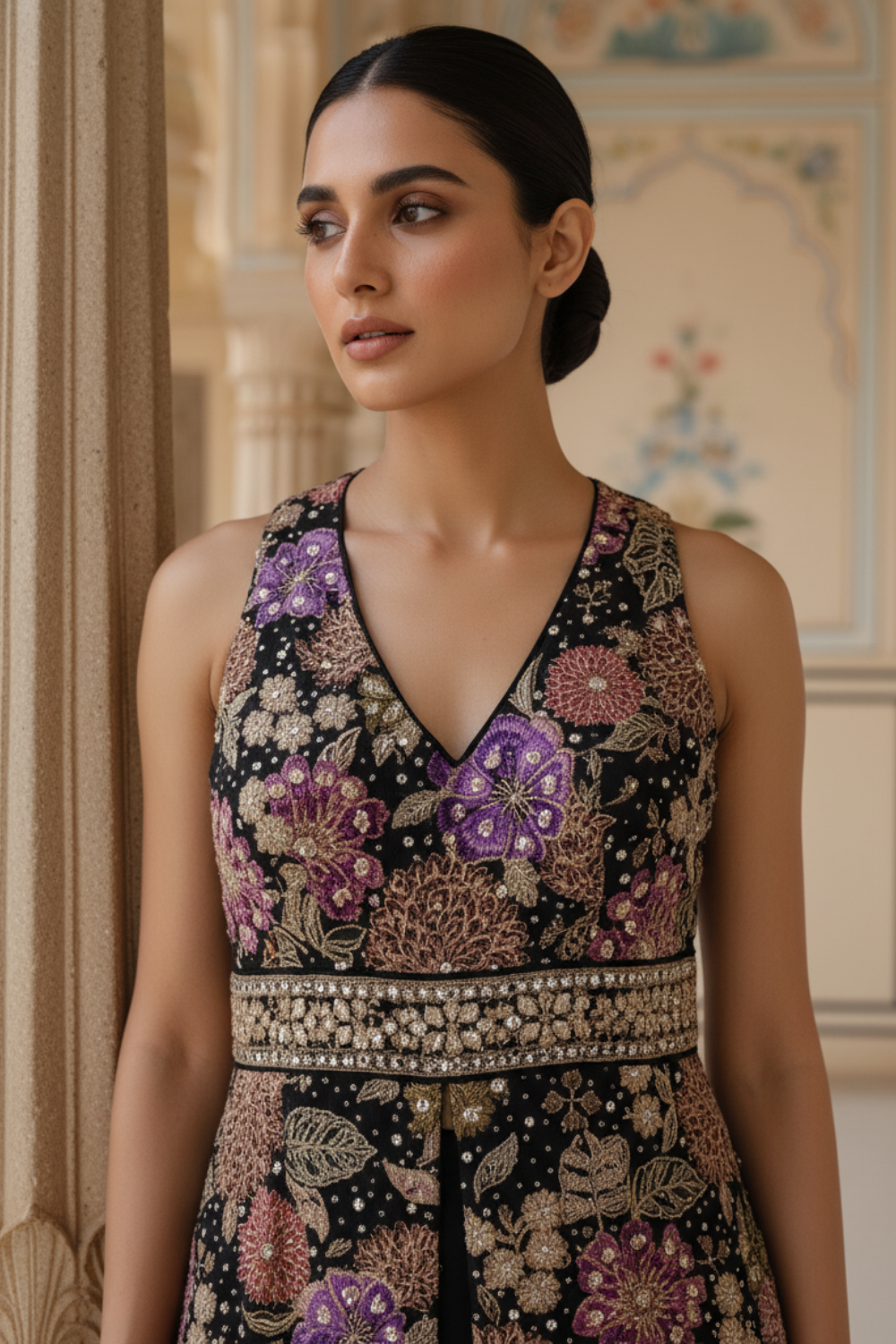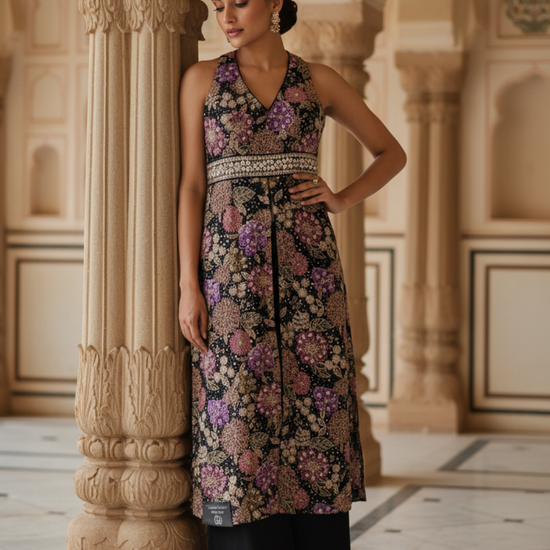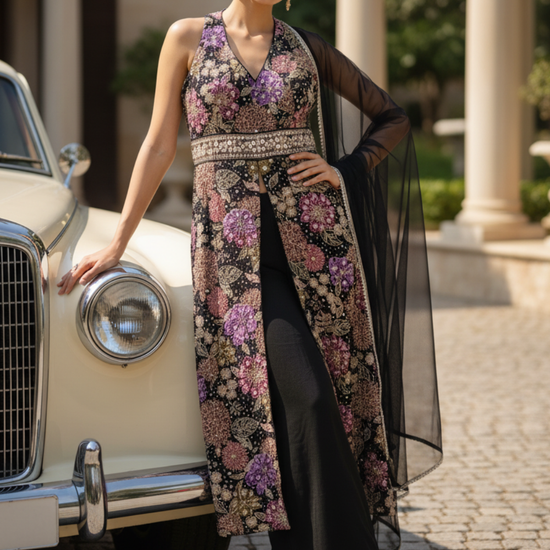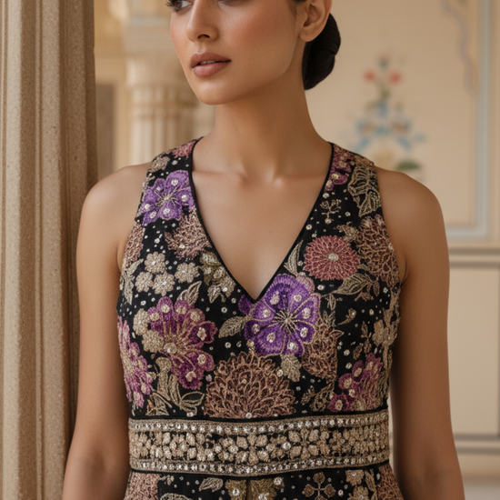 Work : Bead, Floral Print, Mirror, Sequence, Swarovski, Zarkan & Zari Threadwork