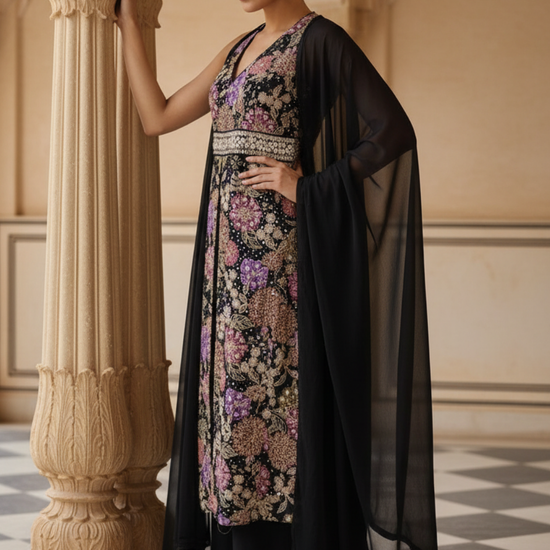 Panna Black Chinon Readymade Suit & Palazzo Pants With Net Dupatta