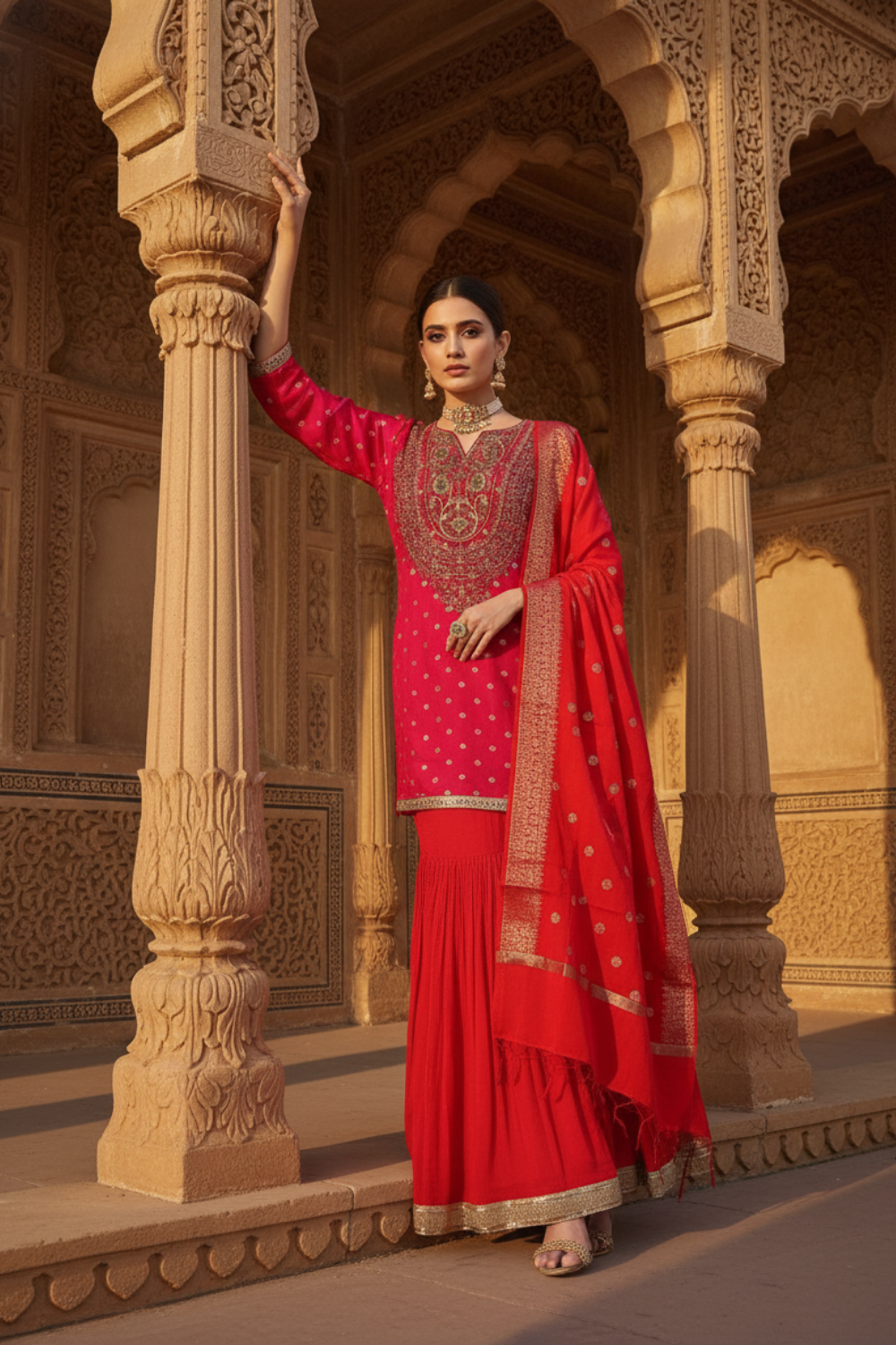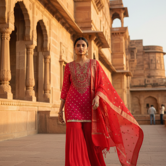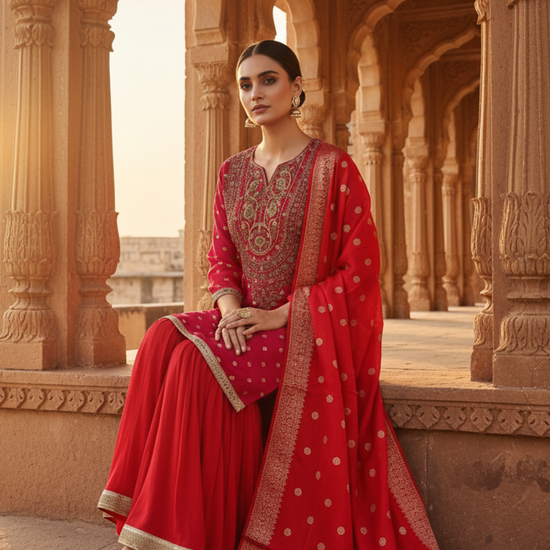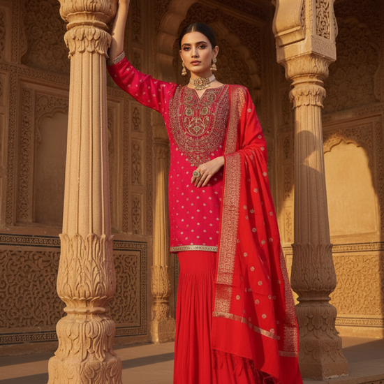 Panna Red Rani Dolna Readymade Sharara Set With Organza Dupatta