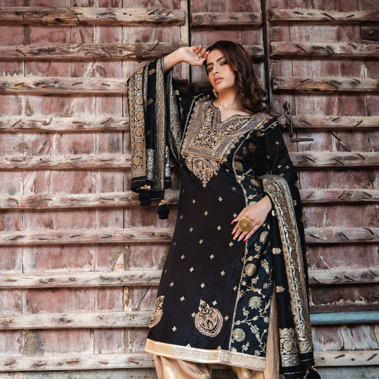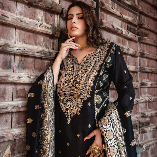 Panna Black Banarasi Silk Readymade Suit And Palazzo With Silk Dupatta