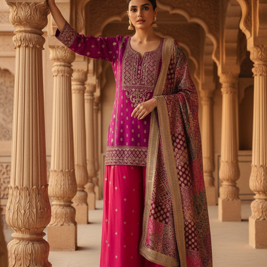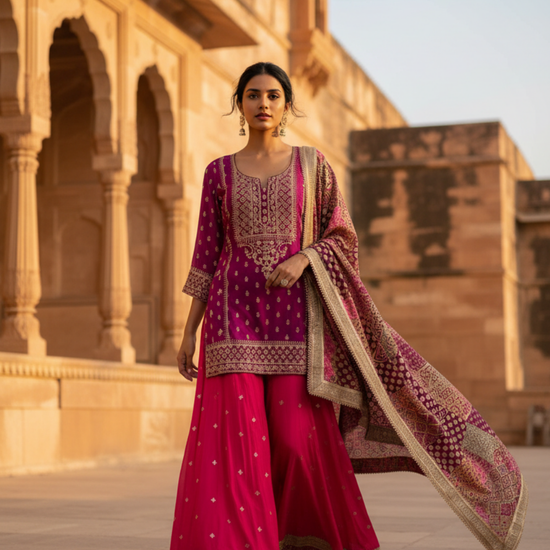 Magenta Banarasi Silk Readymade Sharara Set With Chinon Dupatta – The Panna Shop