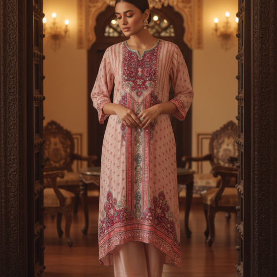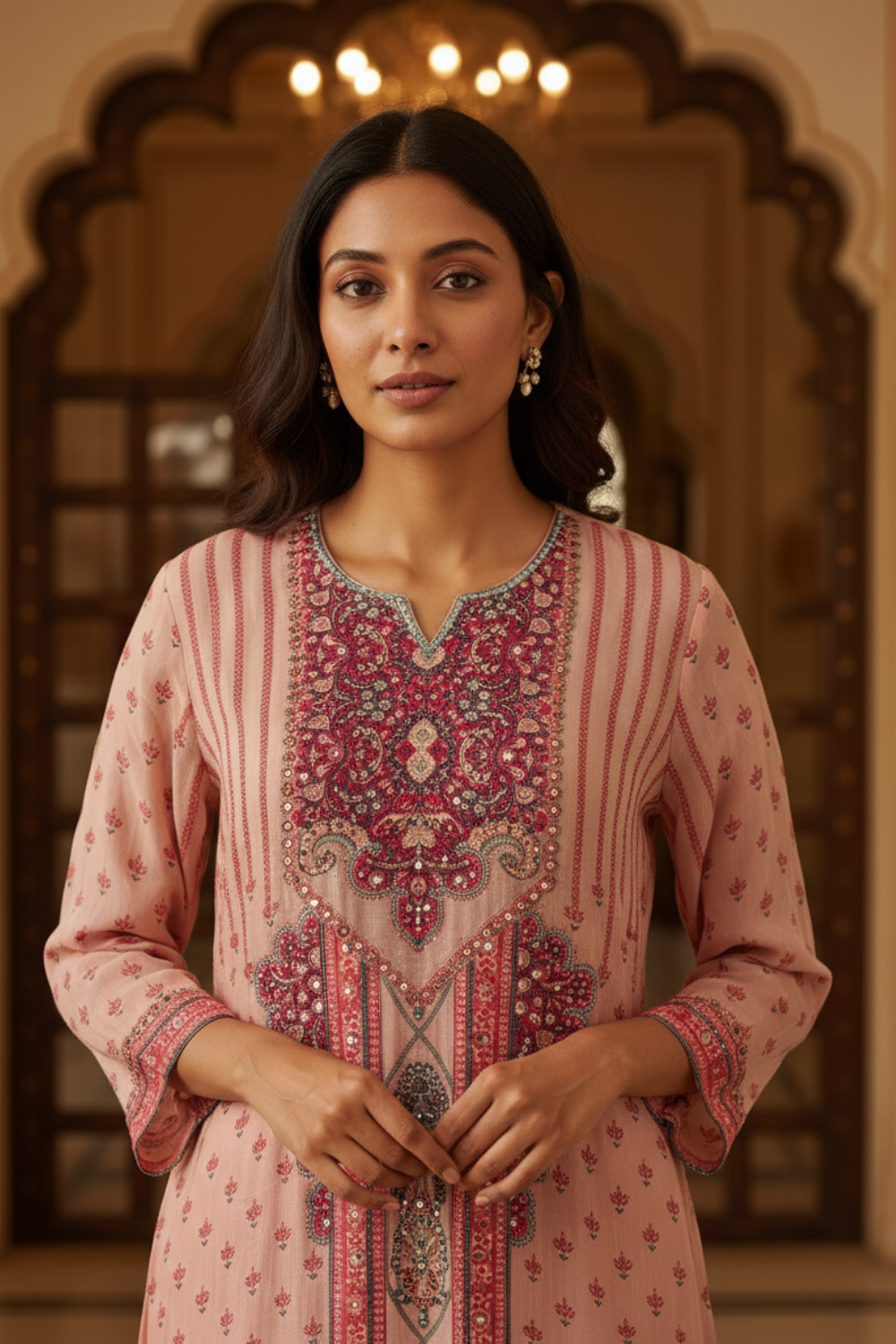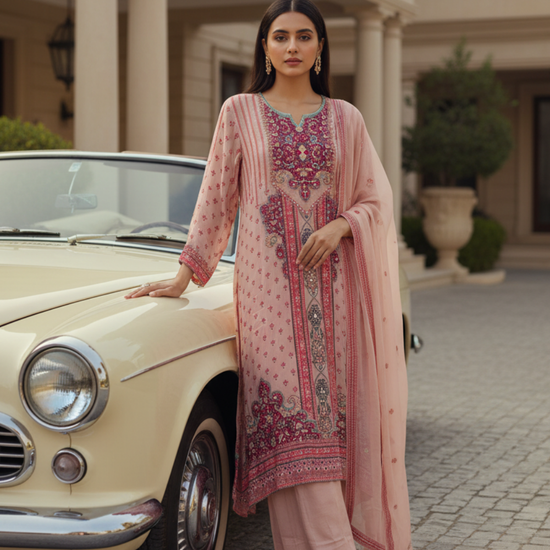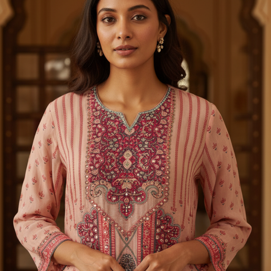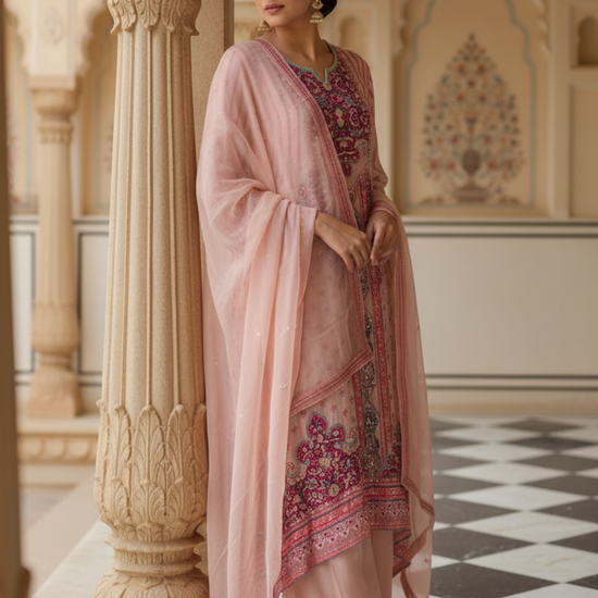 Panna Peach Crepe Readymade Suit & Palazzo Pants With Chiffon Dupatta