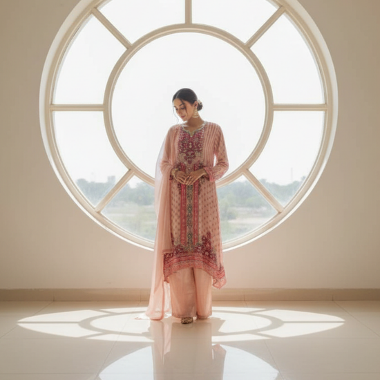 Made with Cutdana, Dabka, Floral Print, Mirror, Sequence & Swarovski on premium Crepe, this ready-made suit is ideal for Formal Occasion. Its timeless design make it a standout. Its pre-stitched design offers ease and sophistication. Its Heavy weight finish ensures effortless elegance. Preserve with Dry Wash / Dry Clean.