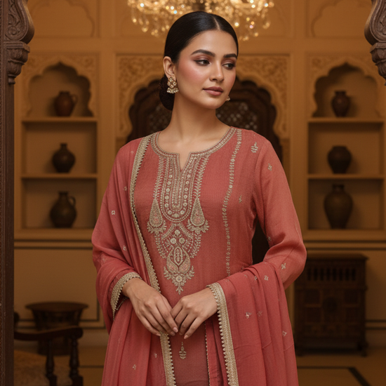 Crafted from Shimmer, this ready-made suit features Sequence & Zari Threadwork and is perfect for Formal Occasion. Its Lightweight design ensures comfort and style. Follow Dry Wash / Dry Clean.