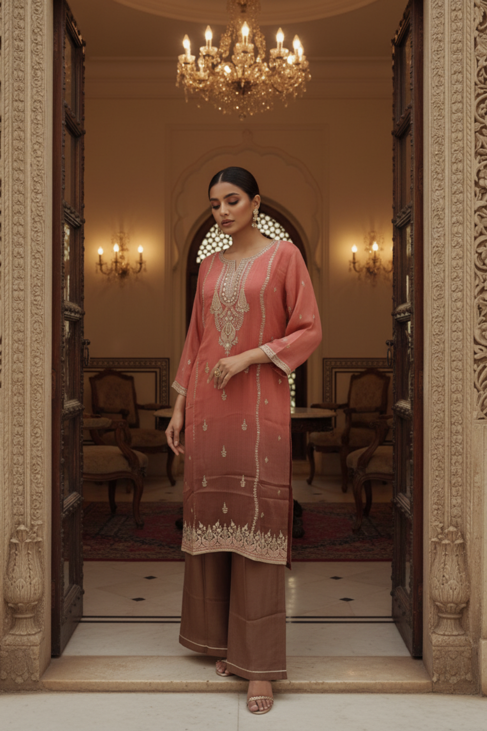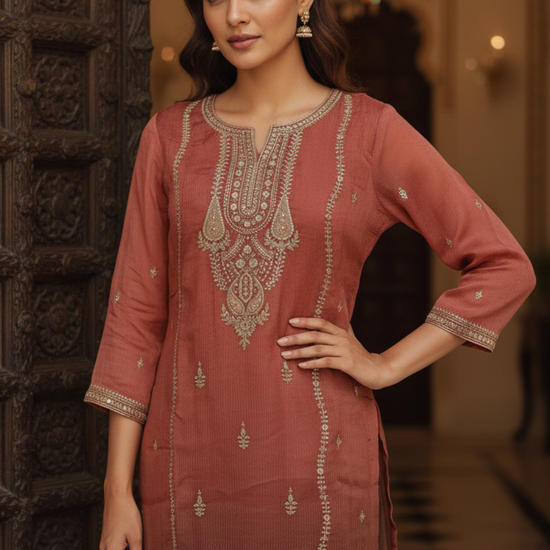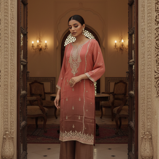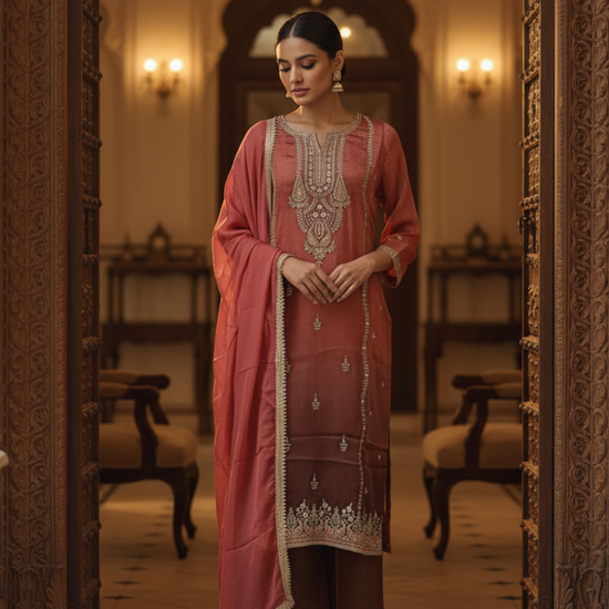 Panna Dark Gajari Shimmer Readymade Suit & Palazzo Pant With Shimmer Dupatta