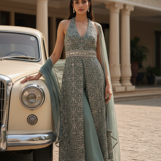 Panna Mint Green Tissue Readymade Suit & Palazzo Pants With Net Dupatta
