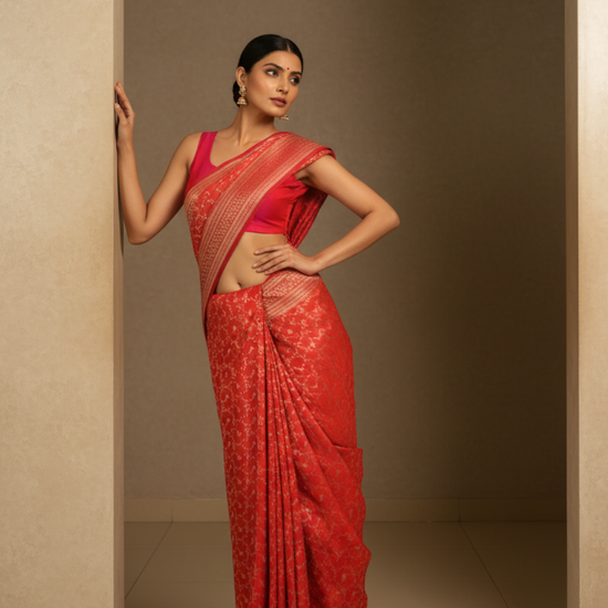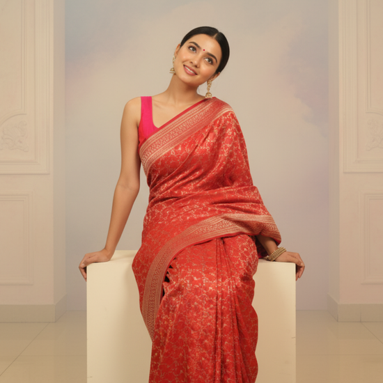 Nature’s Own Couture Rust Banarasi Silk Saree With Unstitched Blouse