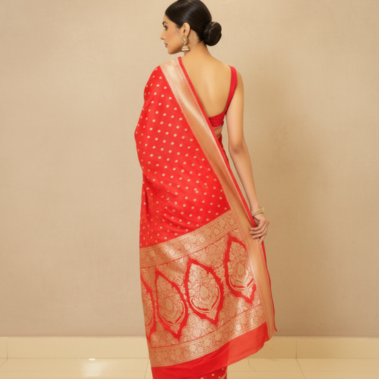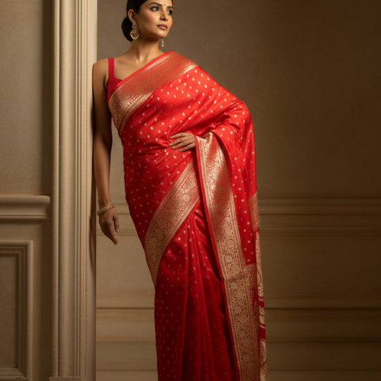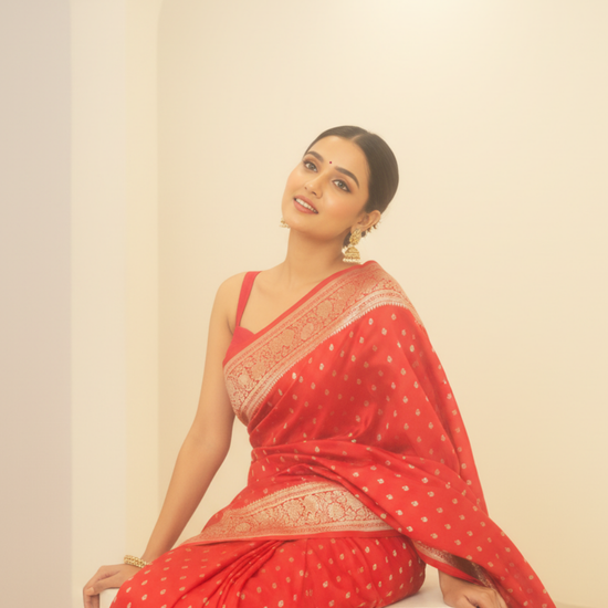 Panna Grace Redefined Red Banarasi Silk Saree With Unstitched Blouse
