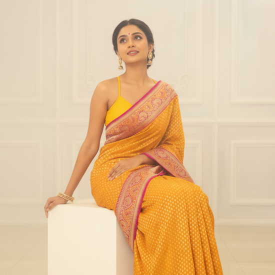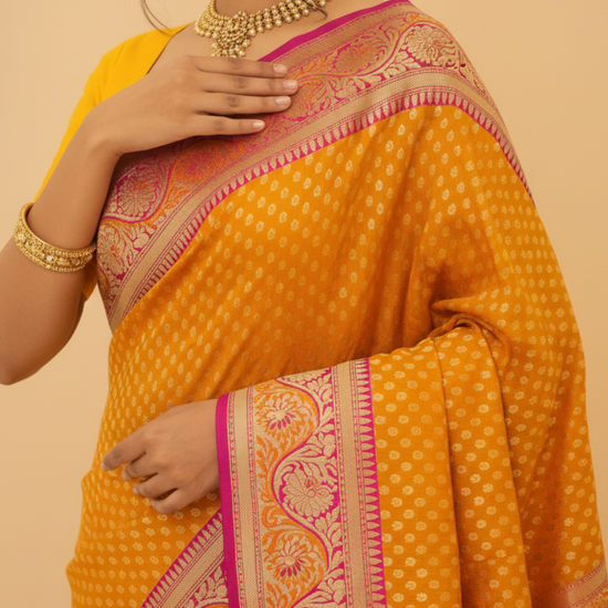 Panna Sunshine Charm Mustard Crepe Silk Saree With Unstitched Blouse