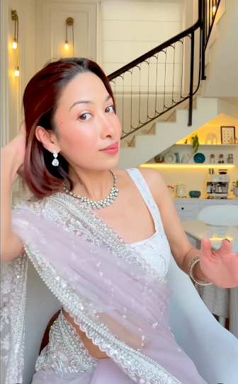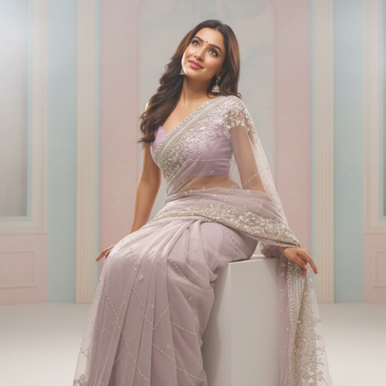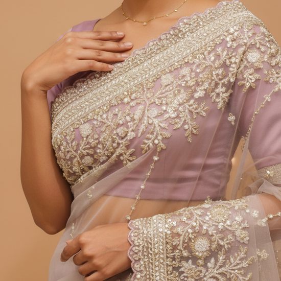 Pink Net Embroidered Saree With Unstitched Blouse (Ft:-Isha Borah) – The Panna Shop
