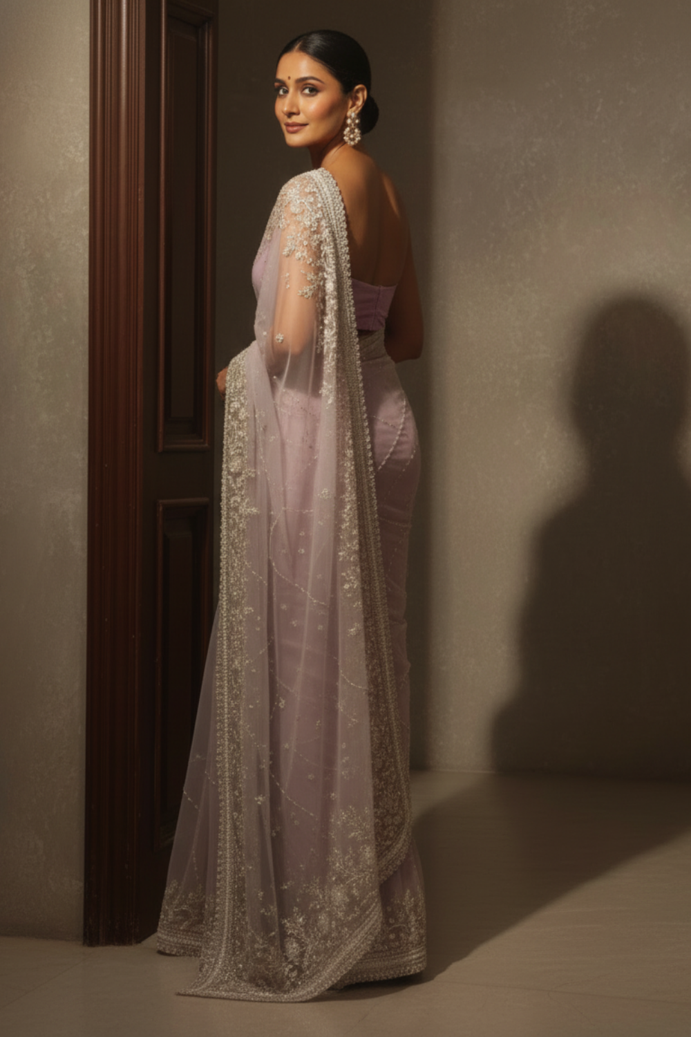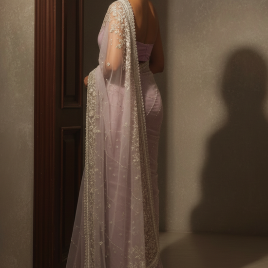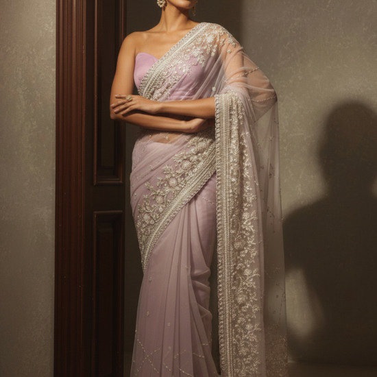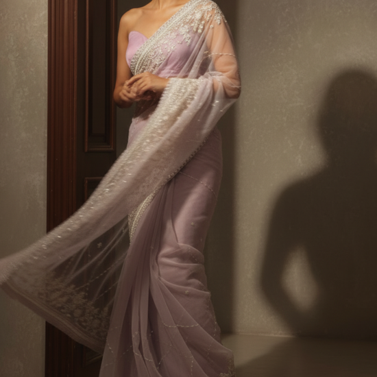 Pink Net Embroidered Saree With Unstitched Blouse (Ft:-Isha Borah)
