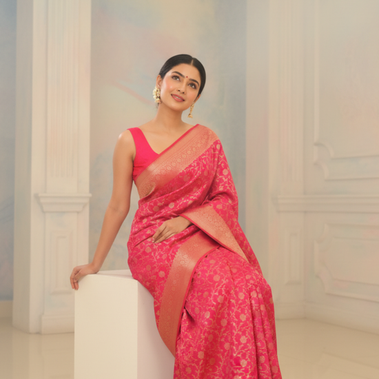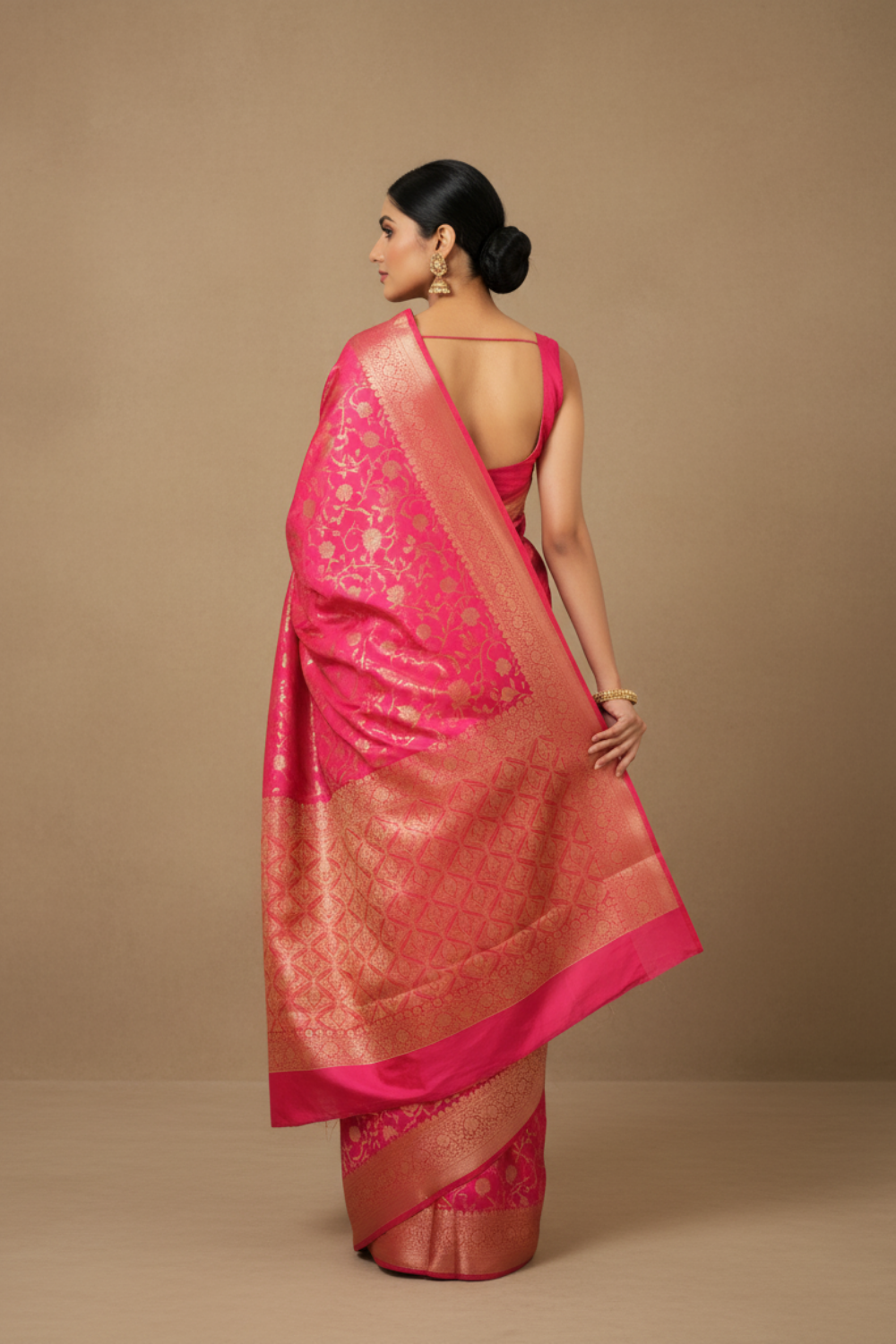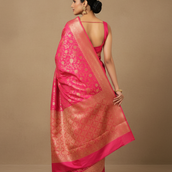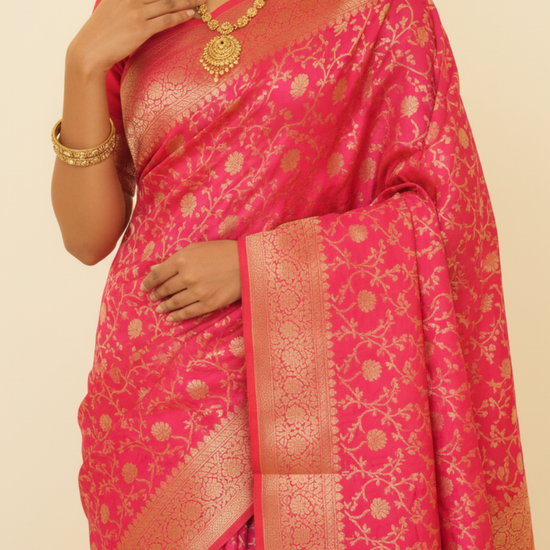 Experience true heritage luxury with this elegant Banarasi silk saree, beautifully crafted with intricate Banarasi woven zari work. The rich silk fabric offers a natural sheen and regal drape, while the detailed zari weaving showcases the timeless artistry and traditional craftsmanship of Banaras. Perfect for weddings, festive occasions, and grand celebrations, this saree embodies classic elegance, cultural richness, and refined sophistication. A masterpiece that adds a touch of royal charm to every moment.