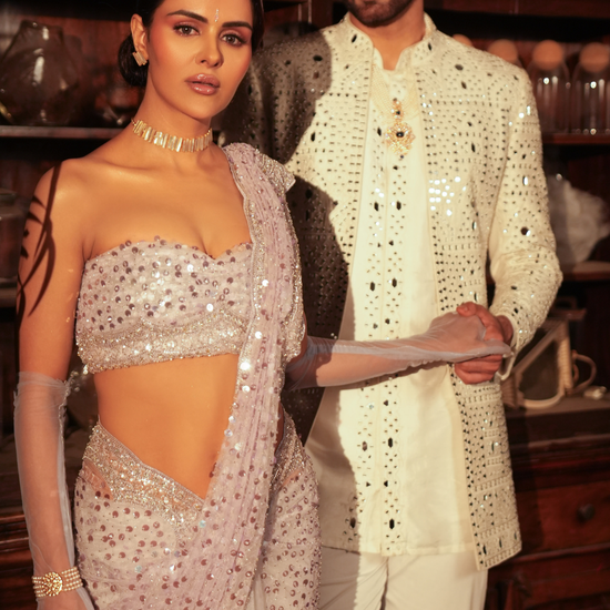 Panna Mauve Net Embroidered Saree With Unstitched Blouse ( Ft- Priyanka Chahar Choudhary )