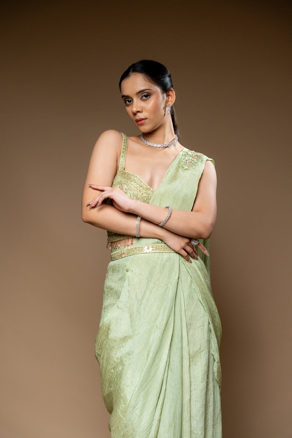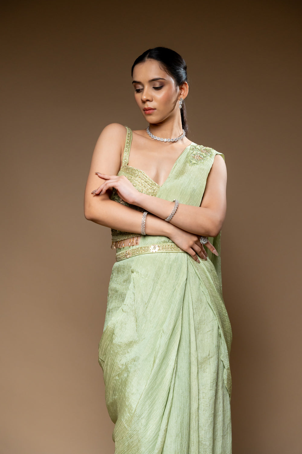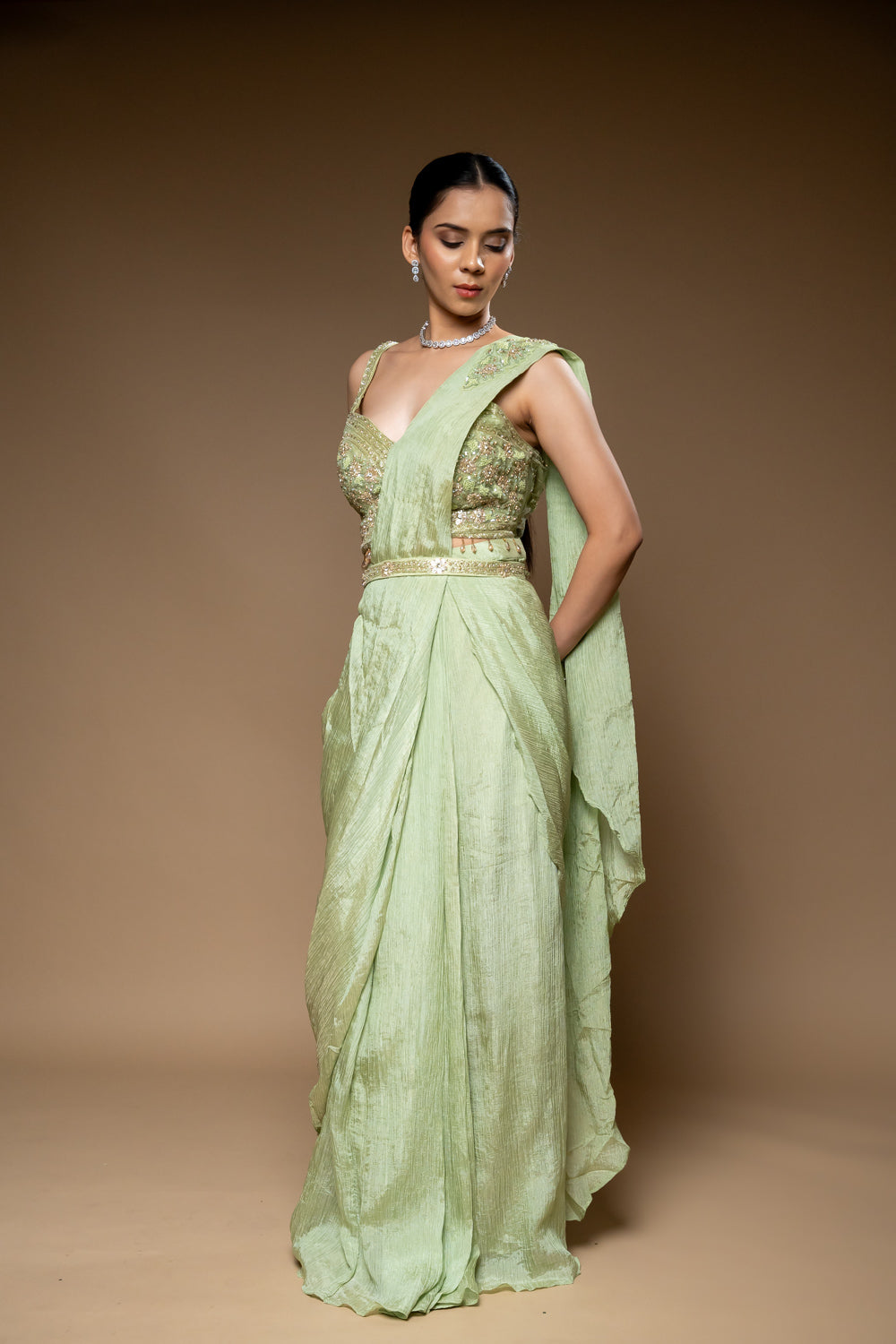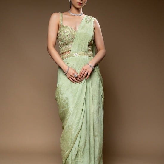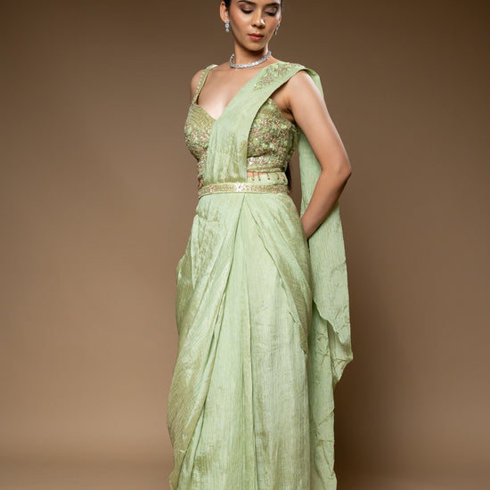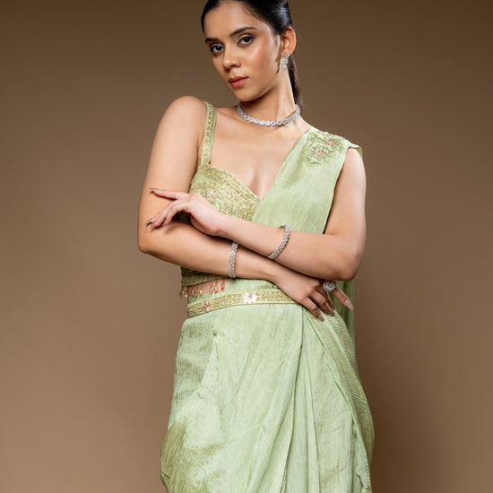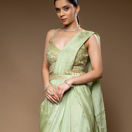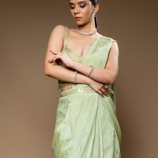 Panna Pista Cutdana, Bead & Sequence Crush Pre-Draped Designer Saree With Readymade Blouse