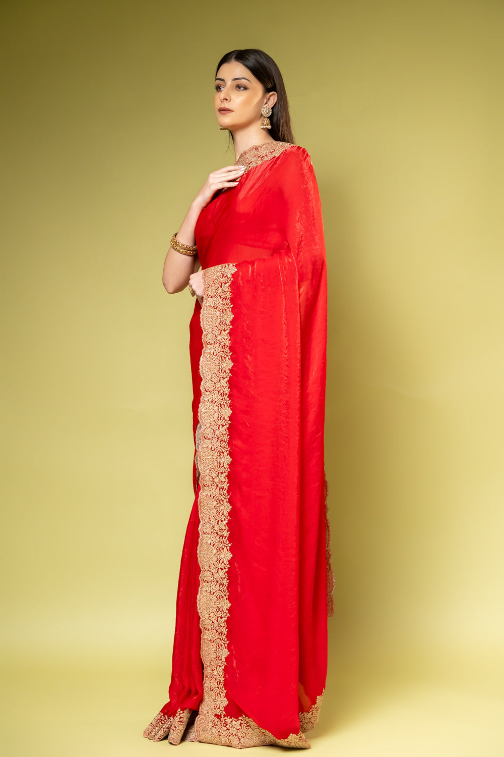 This Chiffon saree, featuring intricate Swarovski & Thread work offers a stunning look for Formal Occasion. The Color Variations add charm and versatility. Dry Wash / Dry Clean recommended for longevity.