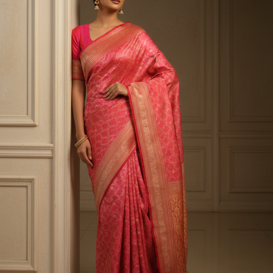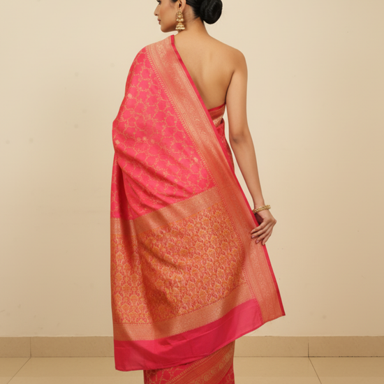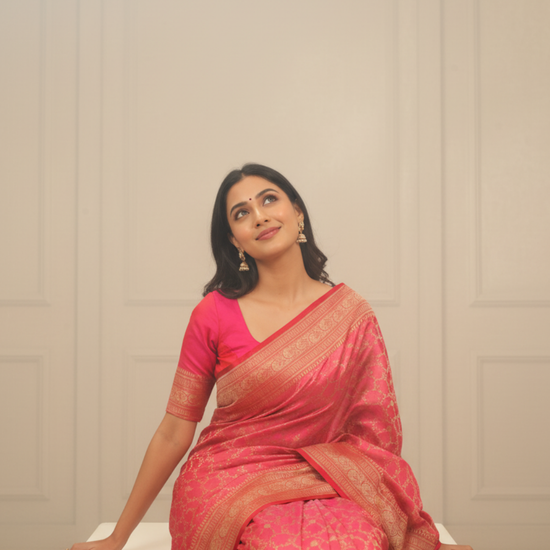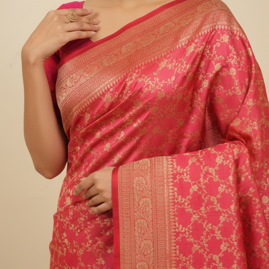 Glow Different In Gajari Banarasi Silk Saree With Unstitched Blouse – The Panna Shop