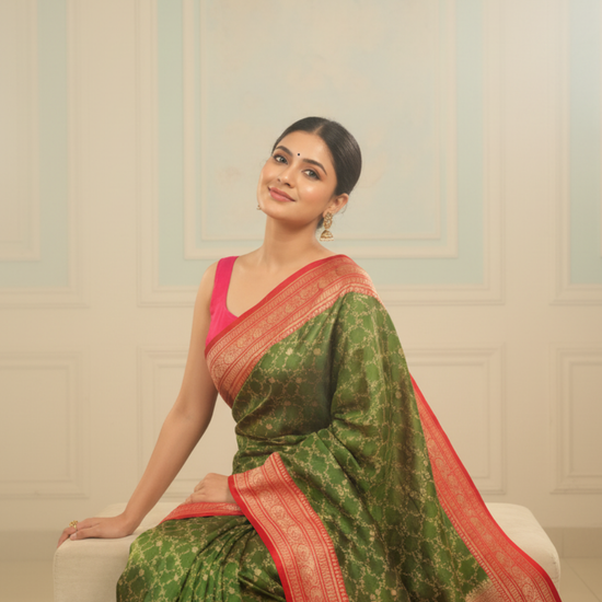Experience true heritage luxury with this elegant Banarasi silk saree, beautifully crafted with intricate Banarasi woven zari work. The rich silk fabric offers a natural sheen and regal drape, while the detailed zari weaving showcases the timeless artistry and traditional craftsmanship of Banaras. Perfect for weddings, festive occasions, and grand celebrations, this saree embodies classic elegance, cultural richness, and refined sophistication. A masterpiece that adds a touch of royal charm to every moment.