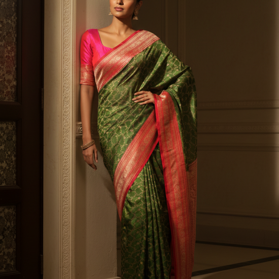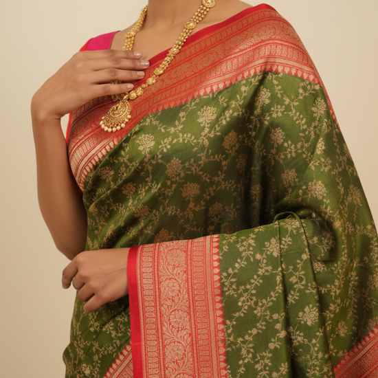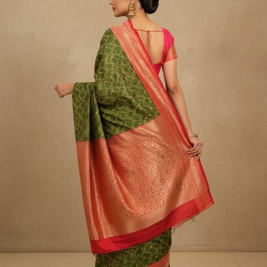 Panna Celebrate Tradition In Mehndi Banarasi Silk Saree With Unstitched Blouse