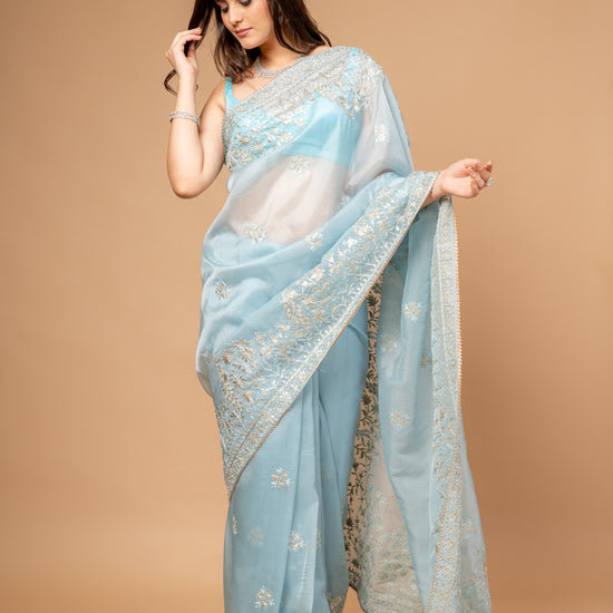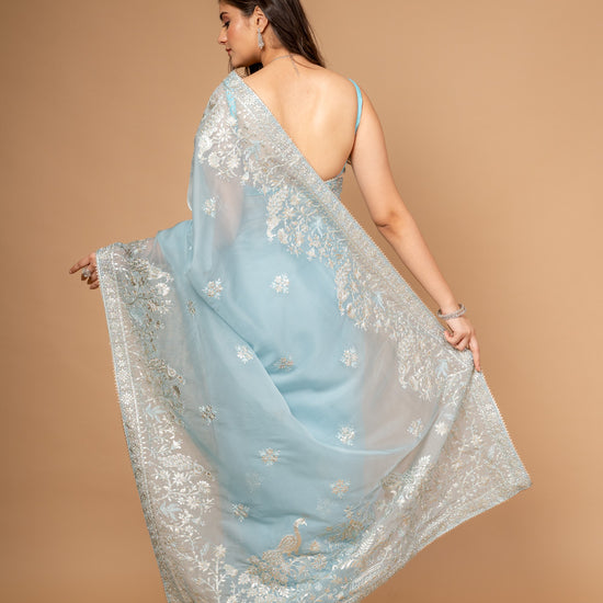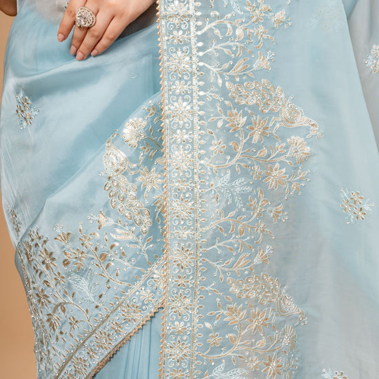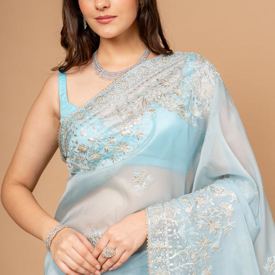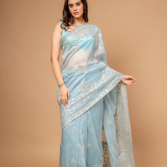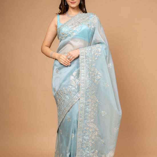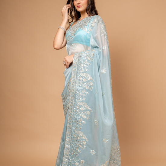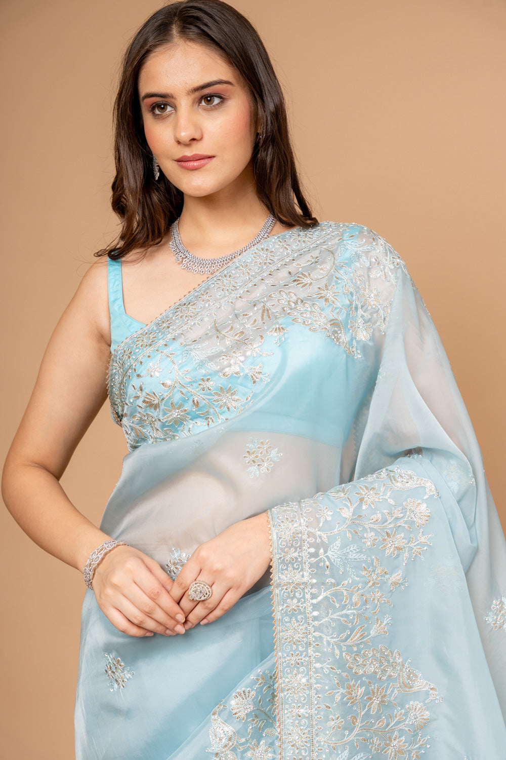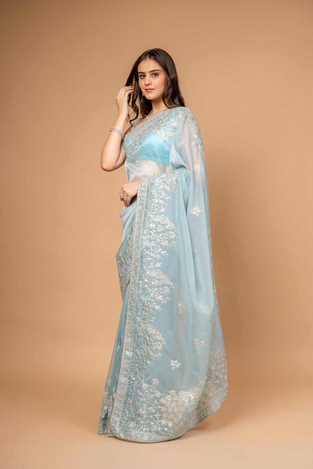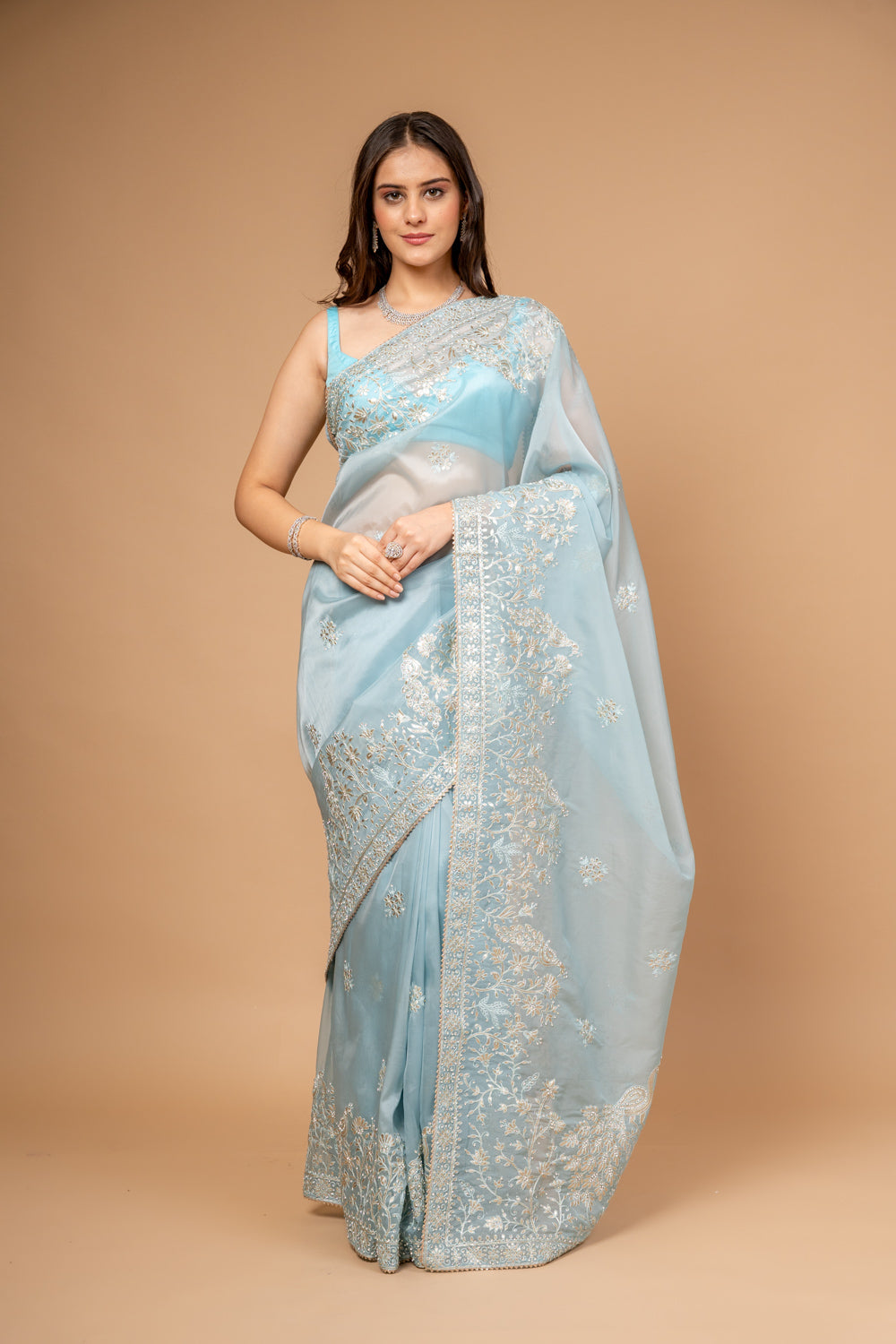 | SilverEmbroidery | FestiveFashion | IndianEthnicWear | PartyWearSaree | SkyBlueOrganzaSaree | EthnicWear | FestiveOccasions |