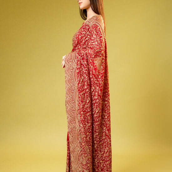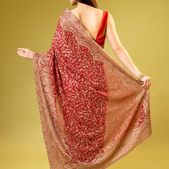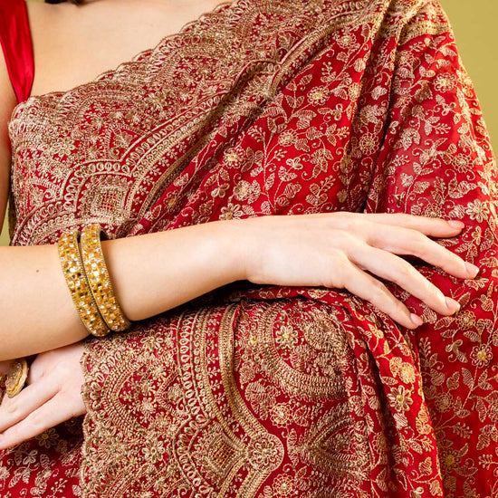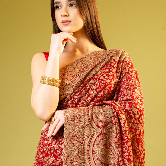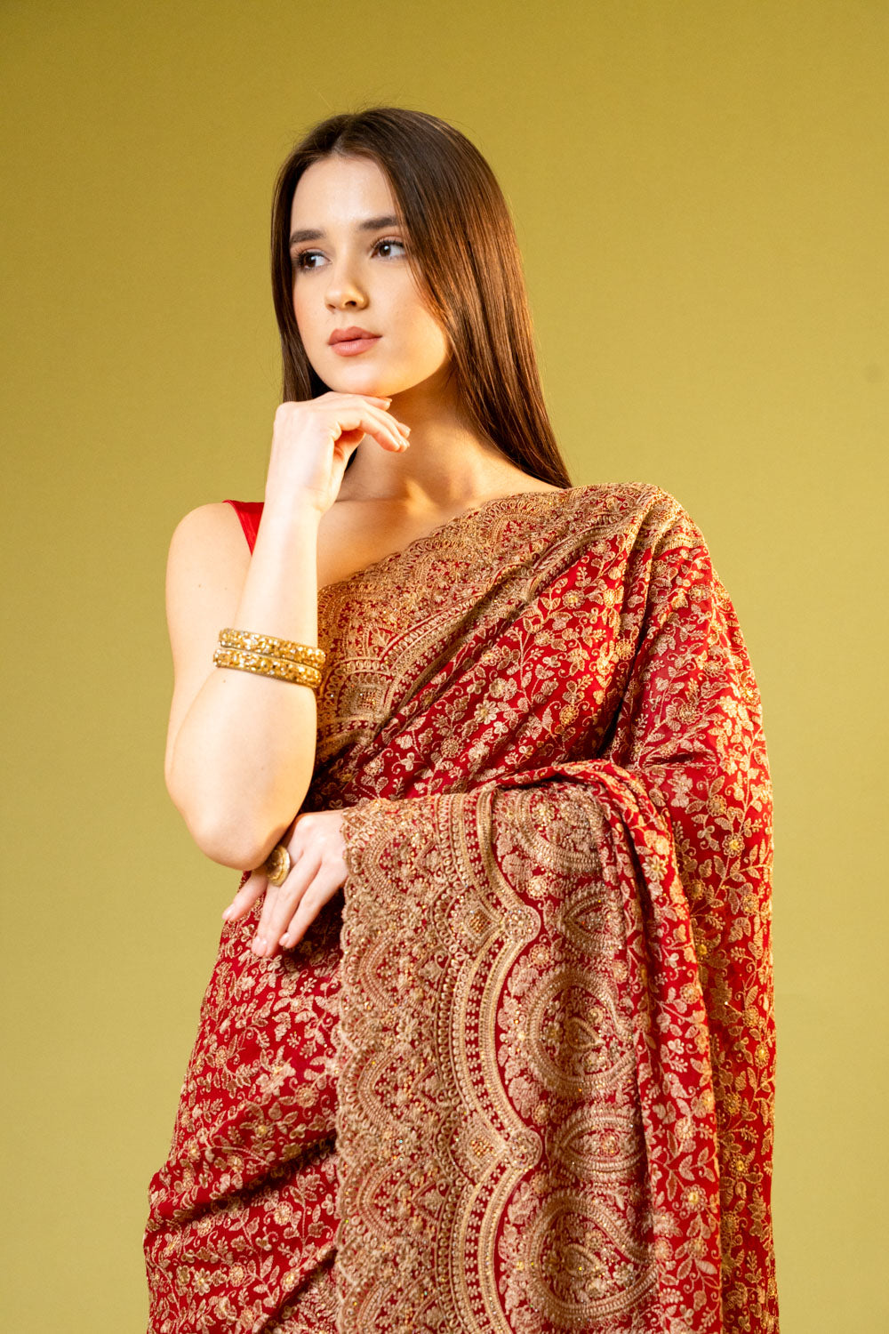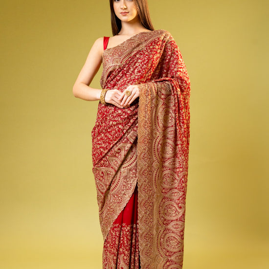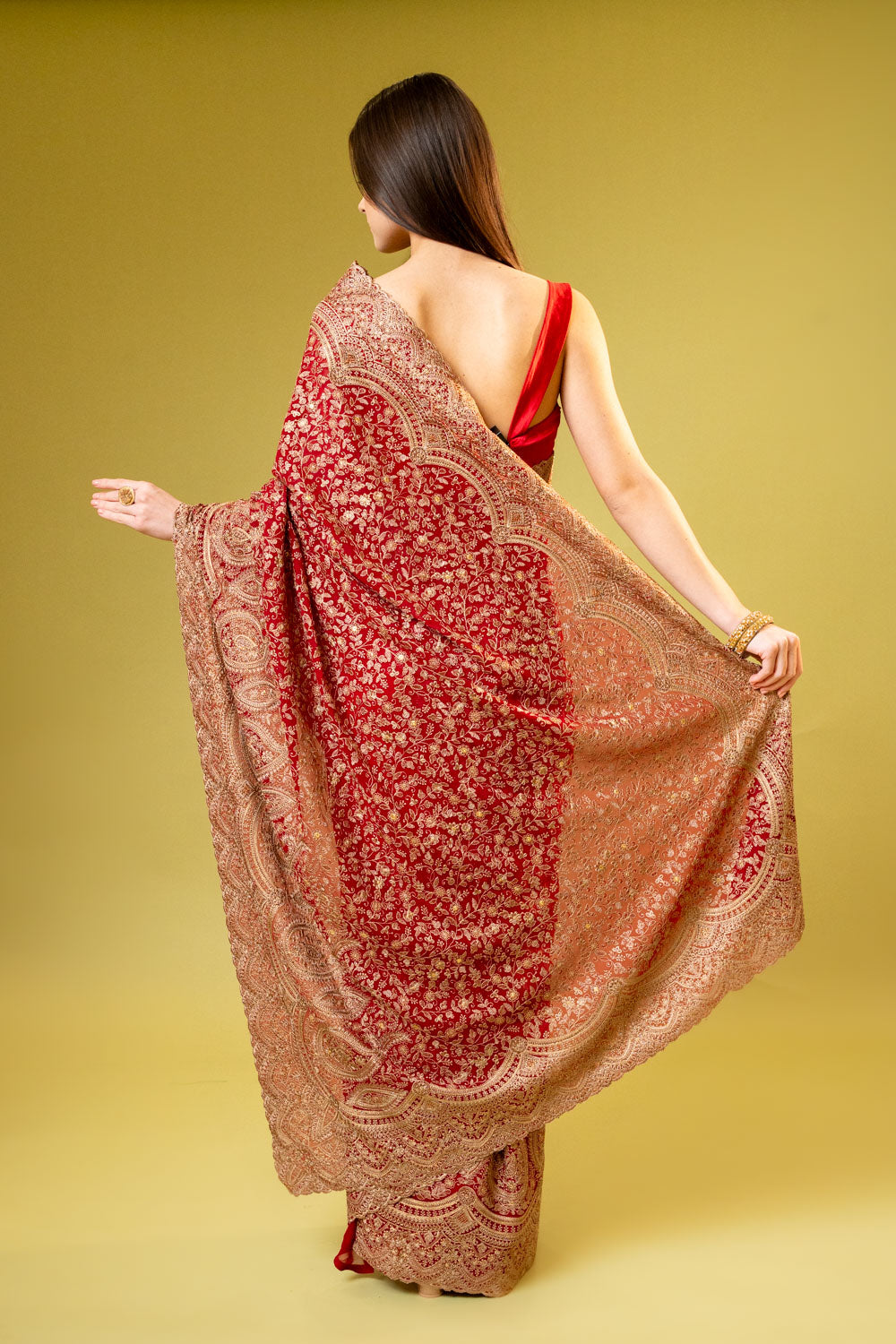 Panna Red Georgette Embroidered Saree With Unstitched Blouse