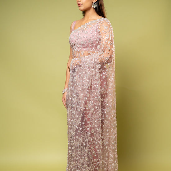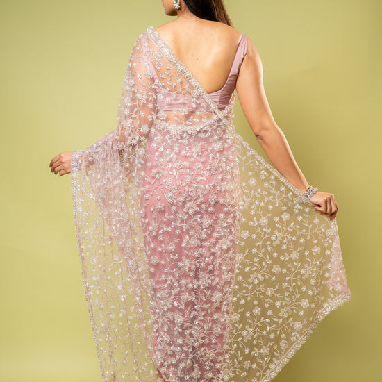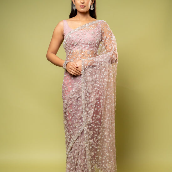 Panna Onion Net Embroidered Saree With Unstitched Blouse